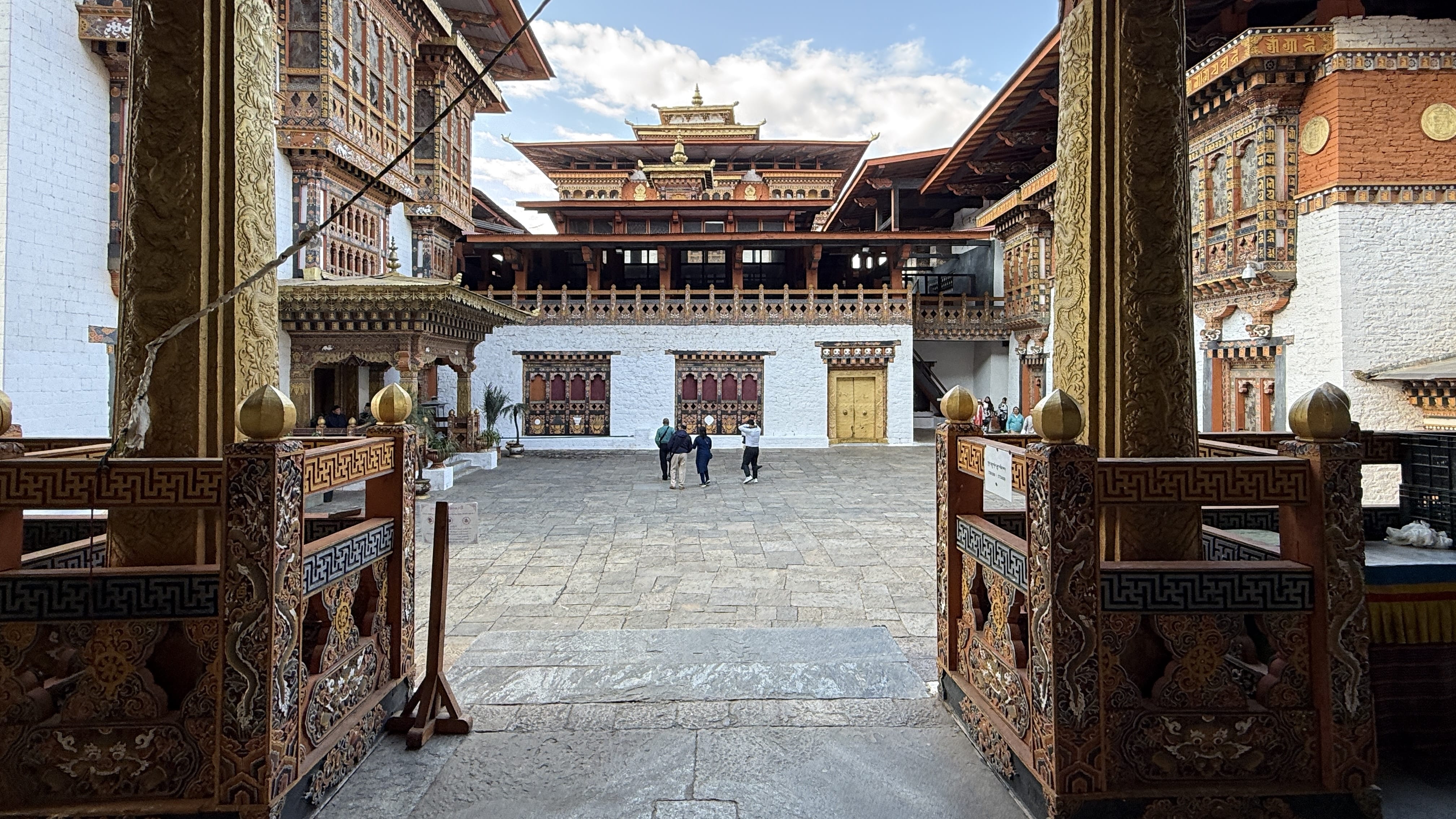 The dzong is massive, intricate, and genuinely stunning, from the 35 gold-topped columns in the main assembly hall to the detailed thangka-style paintings and the monumental statues of Guru Rinpoche, the Buddha, and the Unifier (Shabdrung Ngawang Namgyal).
