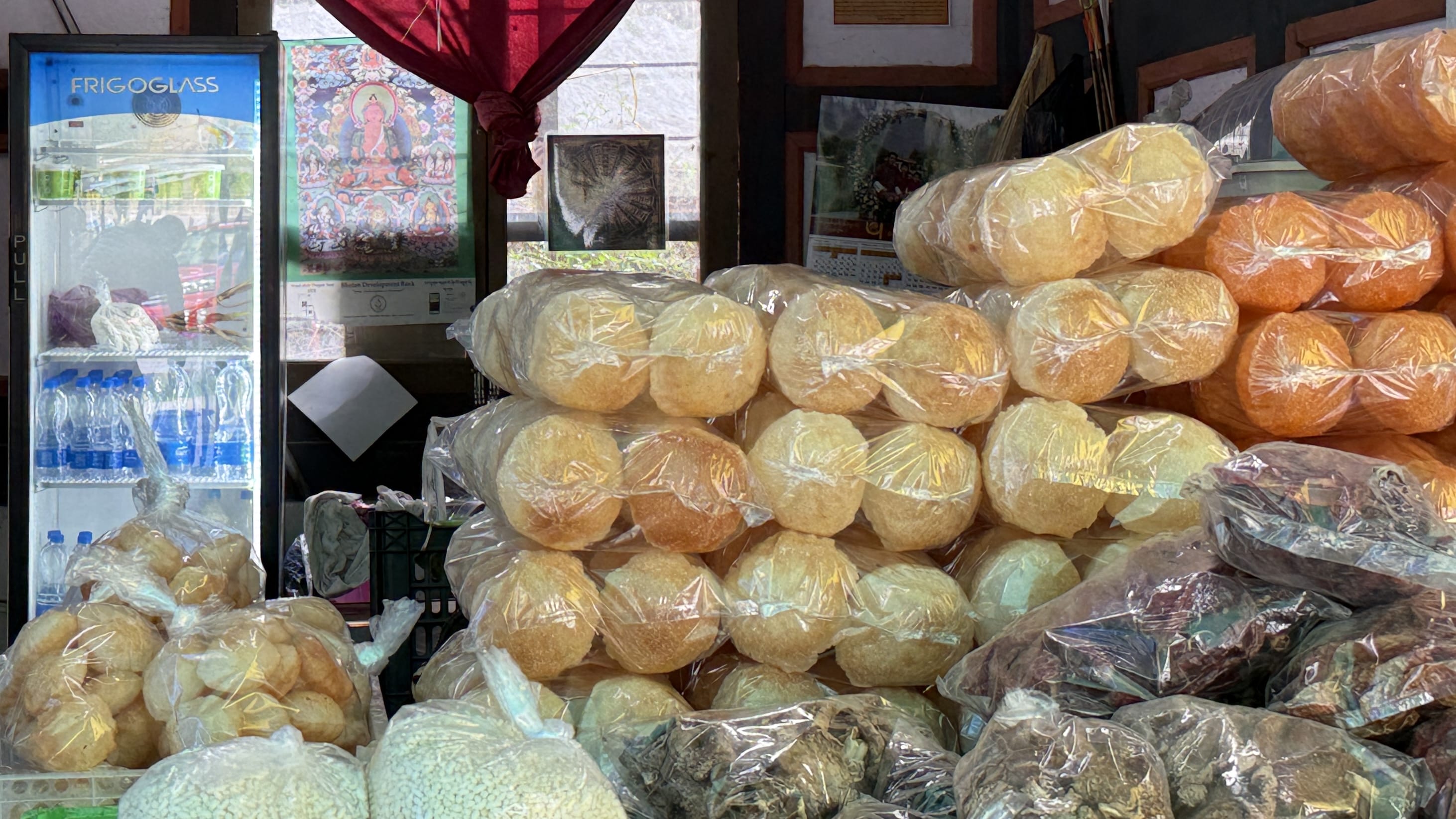 Our first stop was the Bichulum Farmers Market, small but lively, with tables piled high with fresh produce. There were also local snacks—puffed rice balls, roasted peanuts, and brightly colored khabsay, the deep-fried noodle ribbons often made for Losar, the Bhutanese New Year.