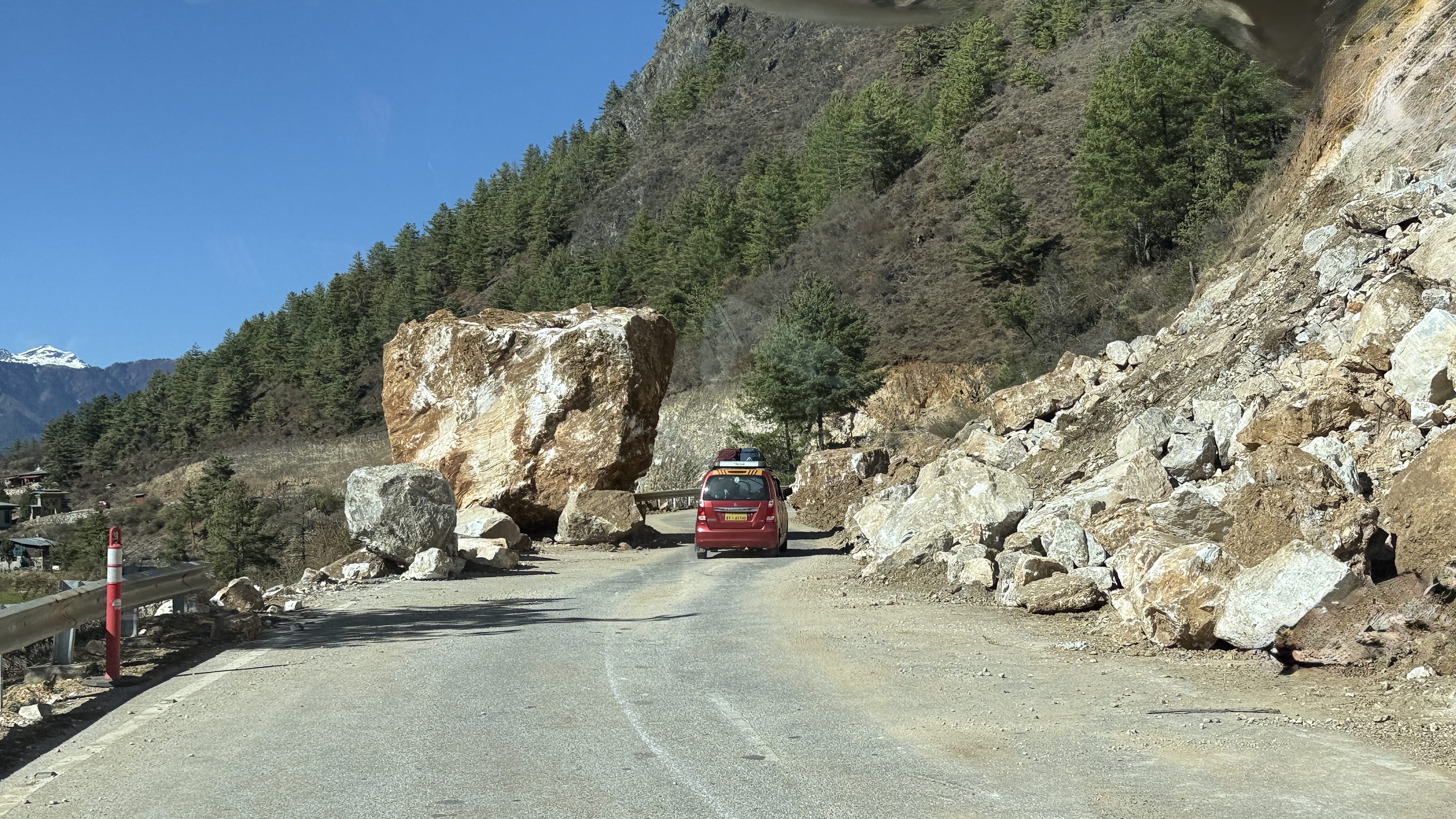 From there, we began the roughly 2.5-hour drive west toward the Haa Valley. The final 60 kilometers were intense — narrow, twisting mountain roads, often without guardrails, and scattered with debris from recent landslides.