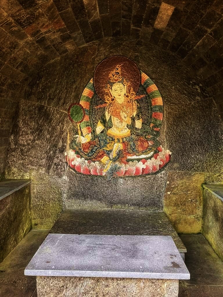There are four main temples and the original meditation cave associated with Guru Rinpoche. The rooms are simple—statues, murals, butter lamps, and cool air that settles around you the moment you step inside. Before beginning my descent, I lit a butter lamp and said a quiet prayer.