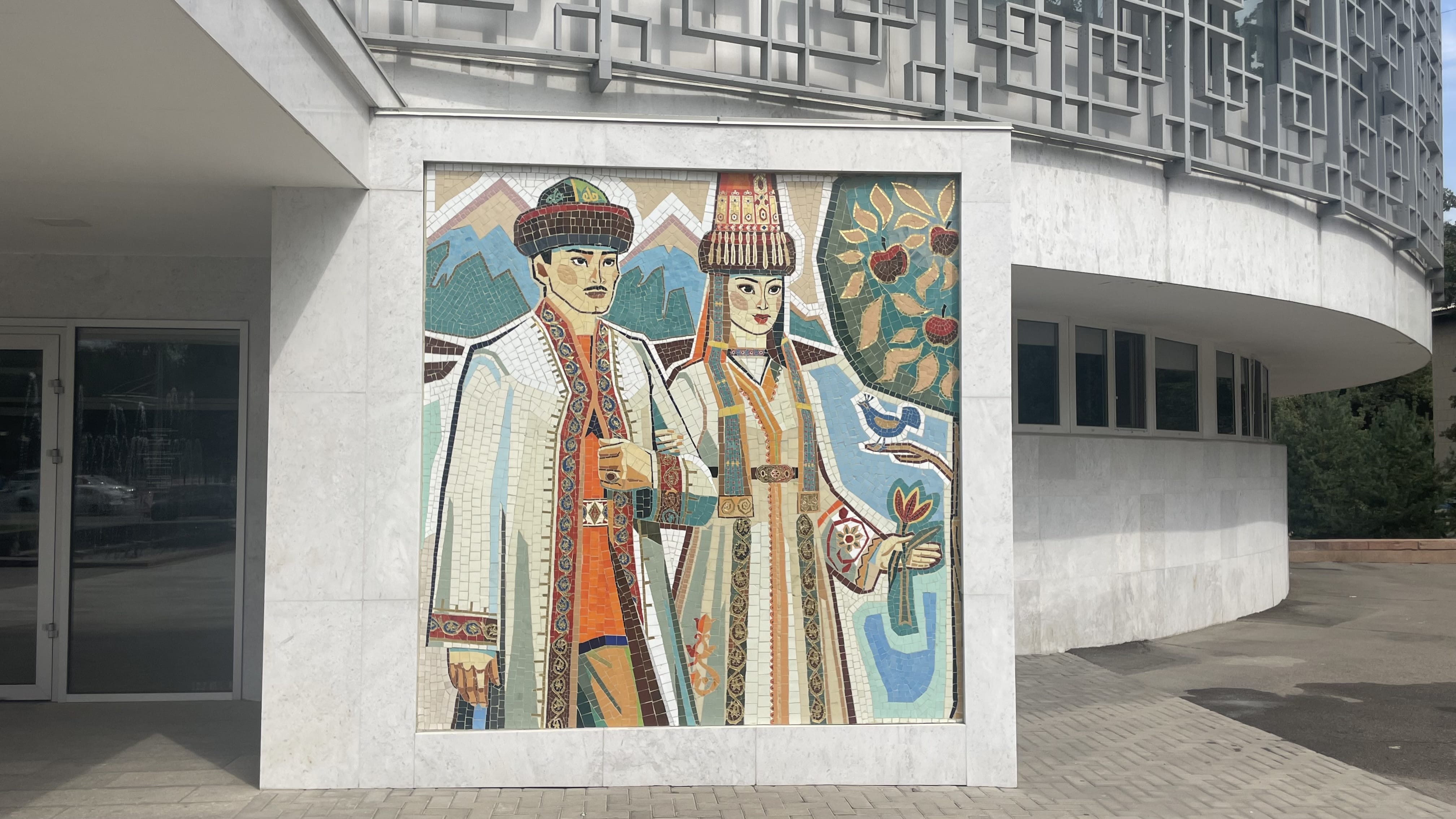 My favorite mosaic I saw that day was a five-paneled work on the front of Hotel Almaty, created in 1965 by Moldakhmet Syzdykovich Kenbaev and Nikolai Vladimirovich Tsivchinskiy. It tells a Kazakh folk tale about two lovers—something like a local Romeo and Juliet—and manages to feel personal in scale despite its size.