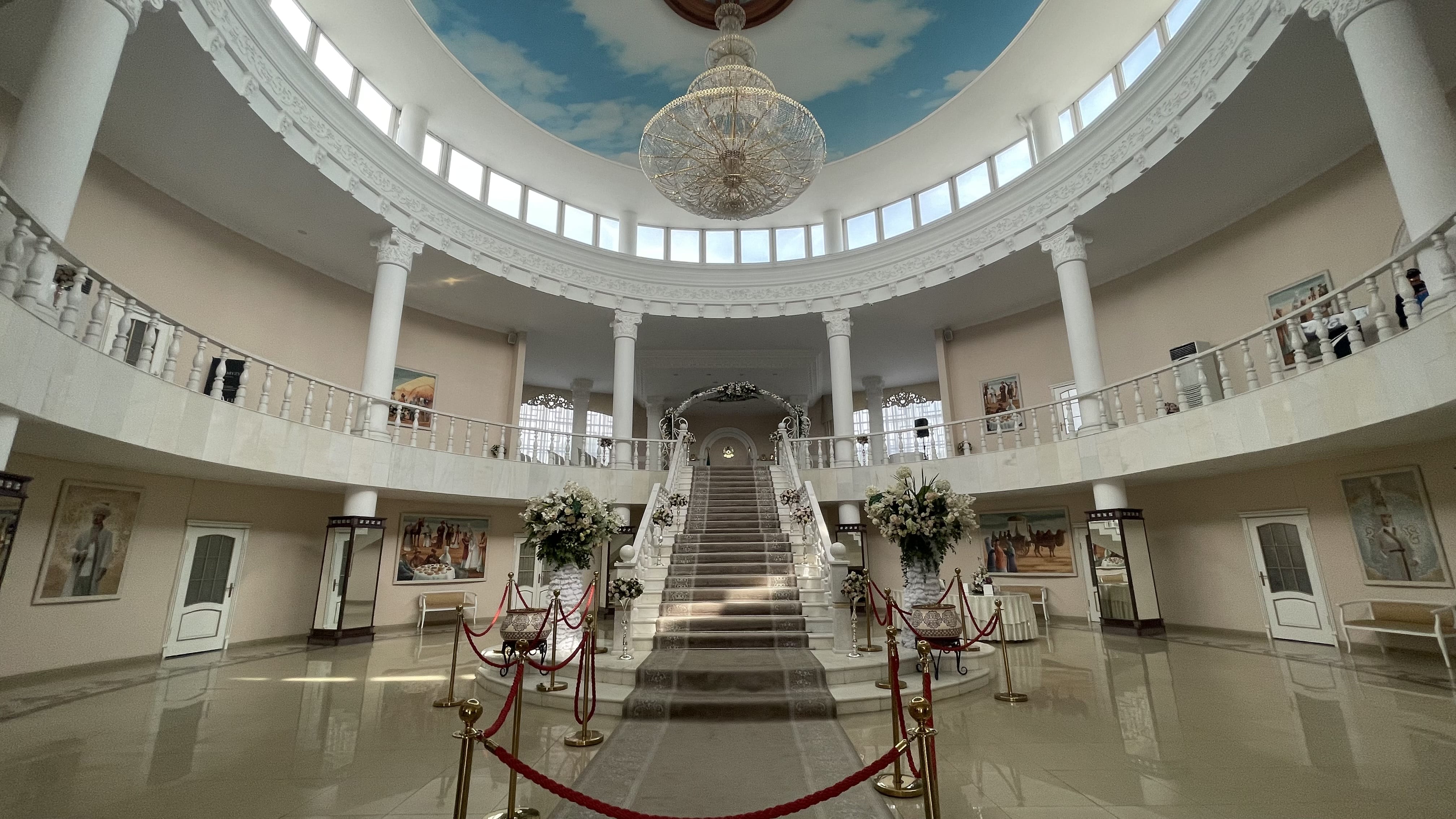 Inside, the mood shifts completely. The interior is grand and theatrical, with a sweeping central staircase, columns, and a massive chandelier suspended beneath a painted dome. Everything feels carefully staged—meant to impress, to mark the moment, and to give even a civil ceremony a sense of importance. It’s a familiar contrast in Soviet architecture: restrained on the outside, unexpectedly ornate once you step inside.