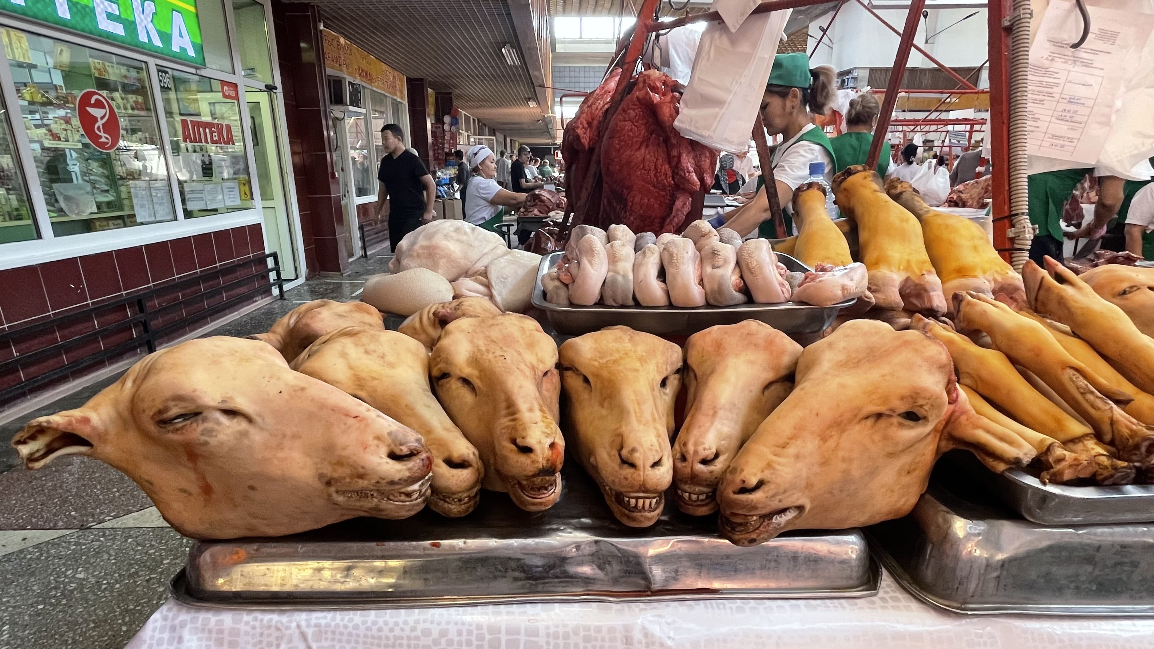 The Kazakh people enjoy their meat, as evidenced by the amount for sale here — goat, cow, horse, poultry, and pork.