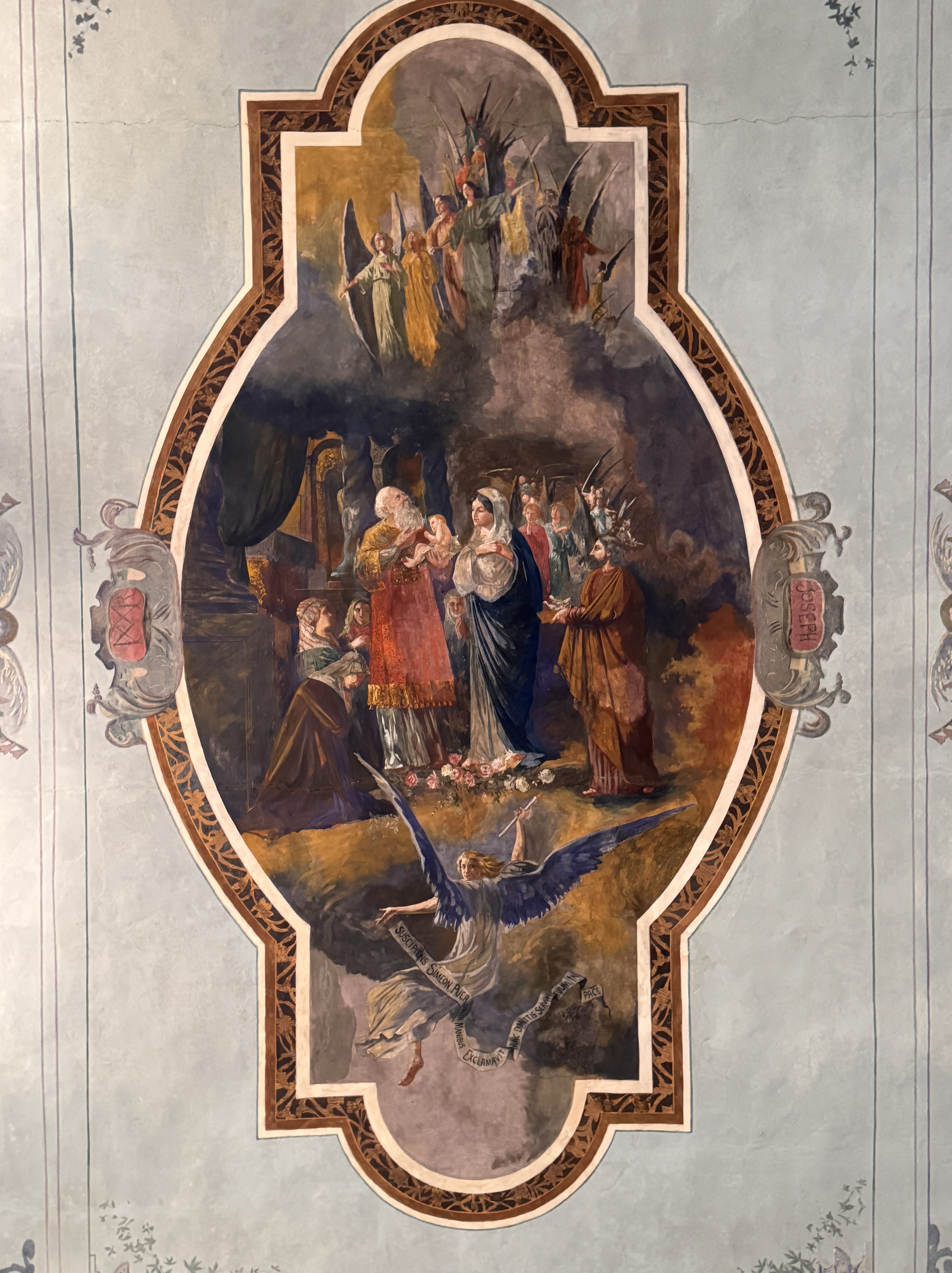 We also stopped at the Iglesia de la Candelaria, a colonial church from the late 1600s and one of Bogotá’s oldest. Inside was a beautiful gilded baroque altarpiece that covered the sanctuary wall, stacked with niches holding statues of saints. The painted ceilings and murals gave the space even more character—biblical scenes framed by ornate borders, with angels hovering above.
