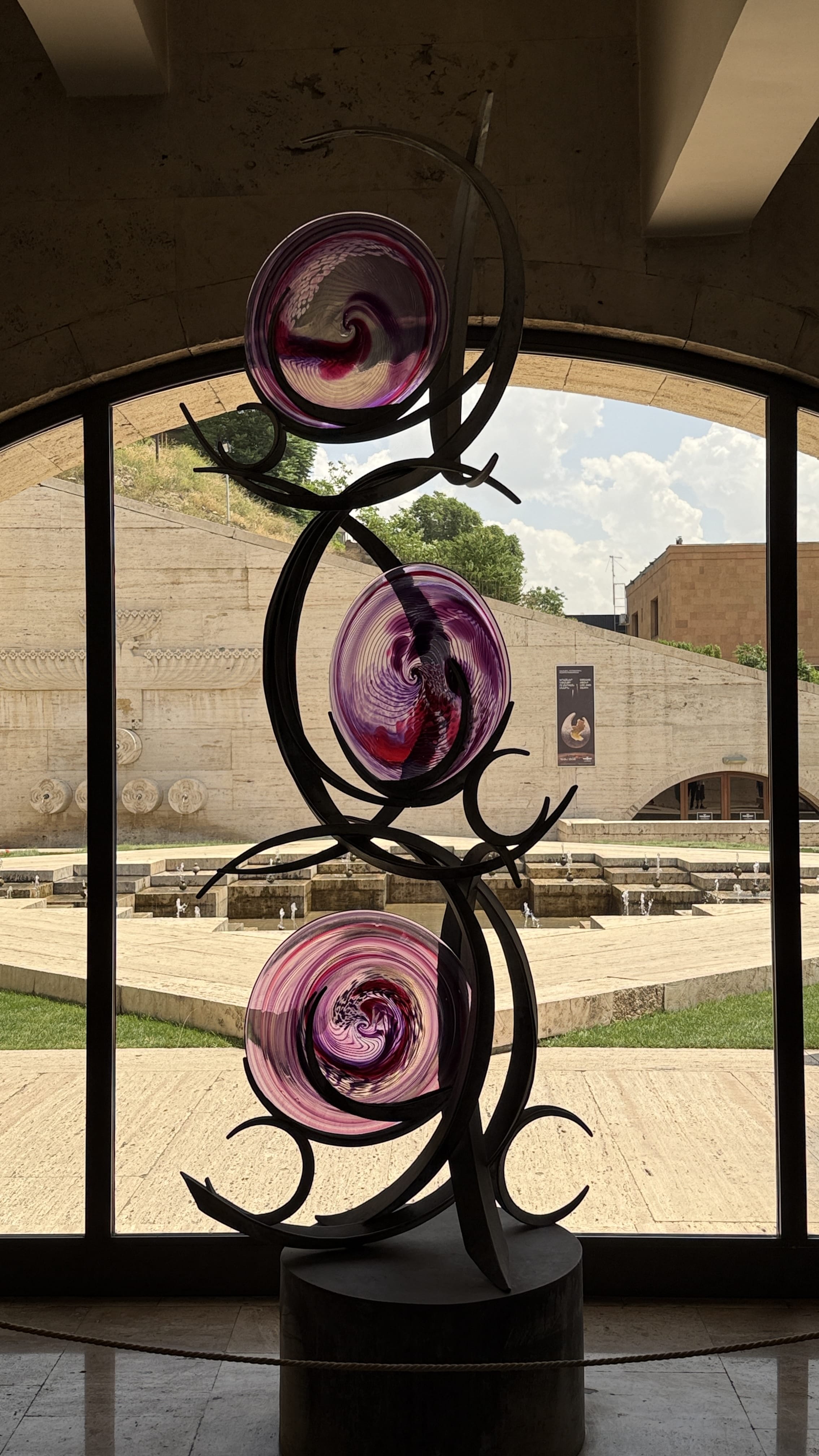 Inside is the Cafesjian Center for the Arts, a contemporary museum spread over five levels, connected by escalators, and filled with glasswork, textiles, and bold experimental pieces. At the base, a landscaped park with benches and even more sculptures makes it as much a gathering place as an art site.
