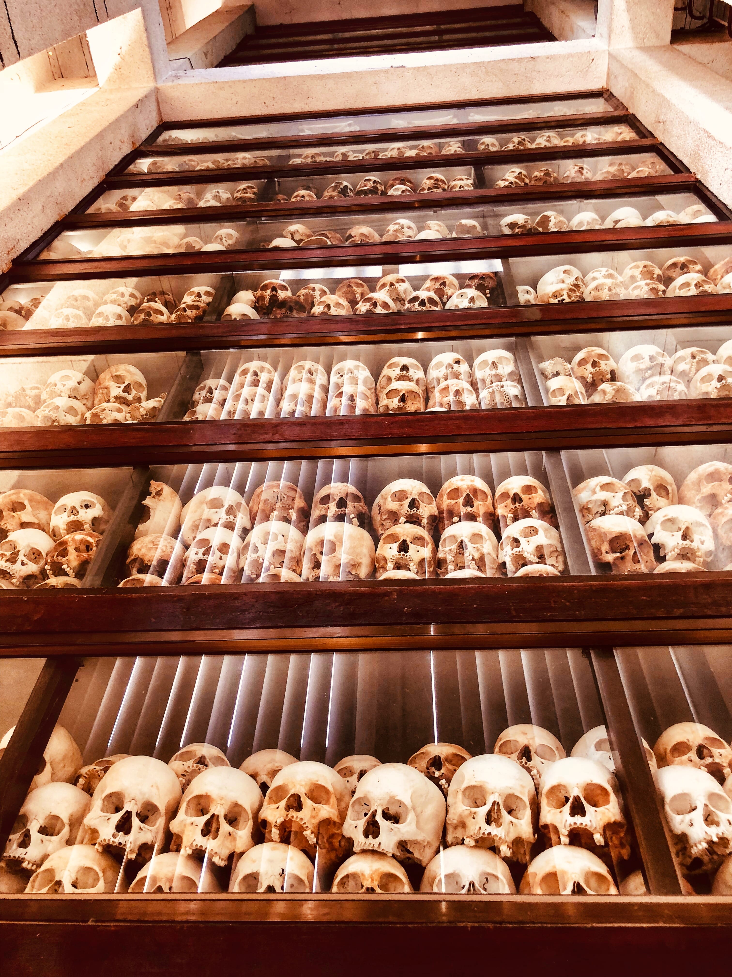 After grabbing lunch, we headed to the Tuol Sleng Genocide Museum—a real shift in tone from the morning. The Phnom Penh Memorial Stupa, filled with the skulls of genocide victims stacked in a glass case from floor to ceiling—5,000 of them—hits you hard.
