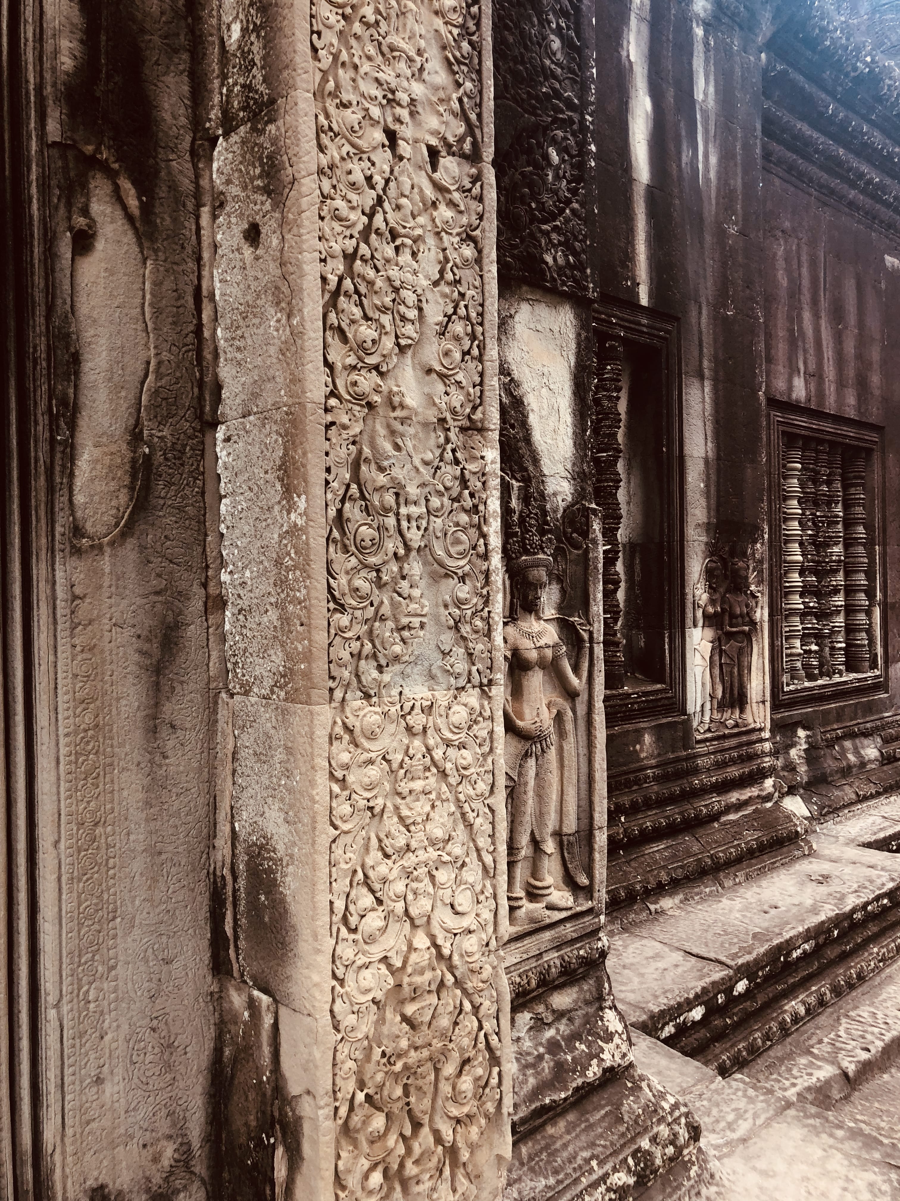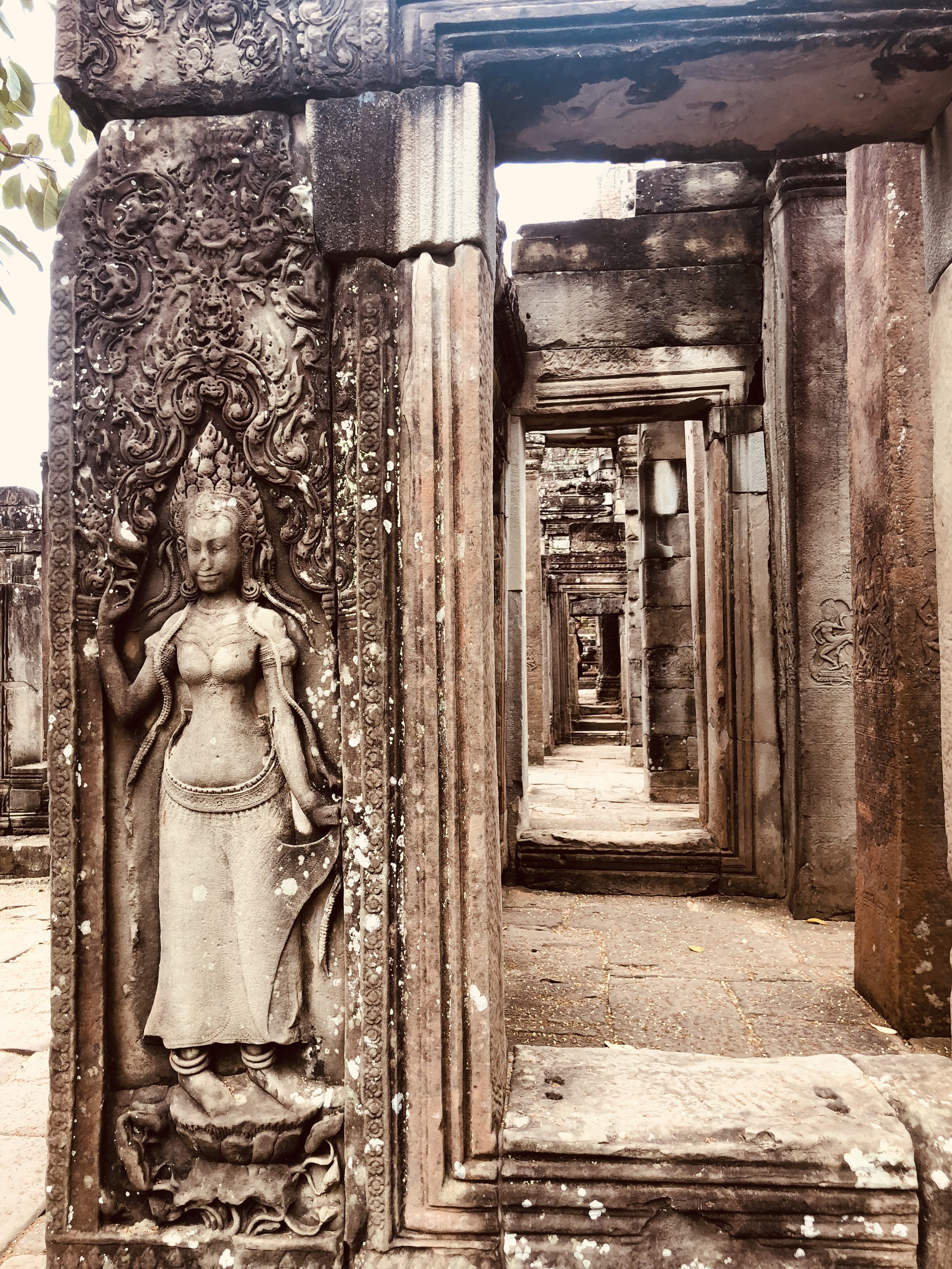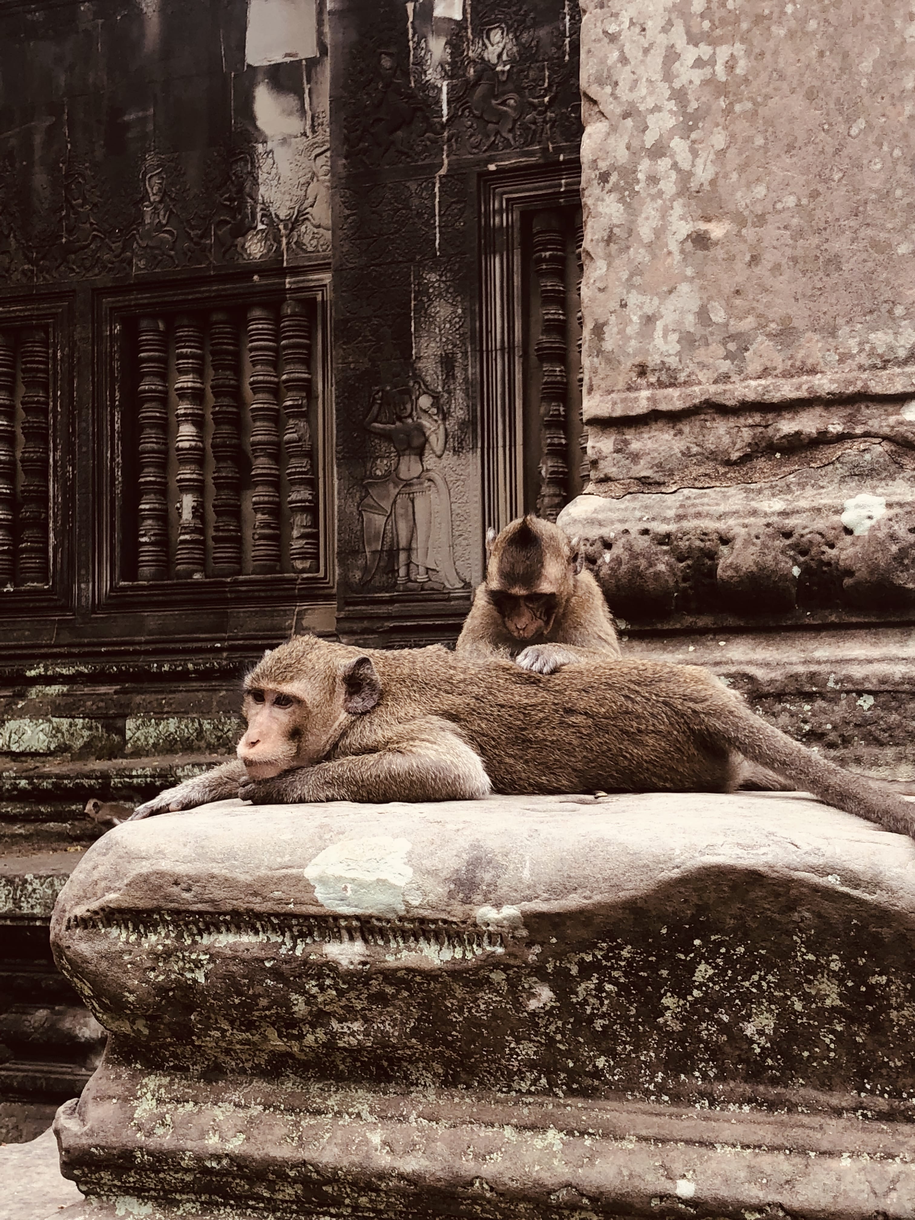Carvings were everywhere you looked—walls, doorways, arches—and the detail was incredible. Inside, the bas-reliefs stretched along the walls, telling stories of epic battles, mythical creatures, and celestial beings. Calling it “craftsmanship” doesn’t even feel right—it was pure artistry. Outside, a few macaques darted around, clearly making the ruins their playground.