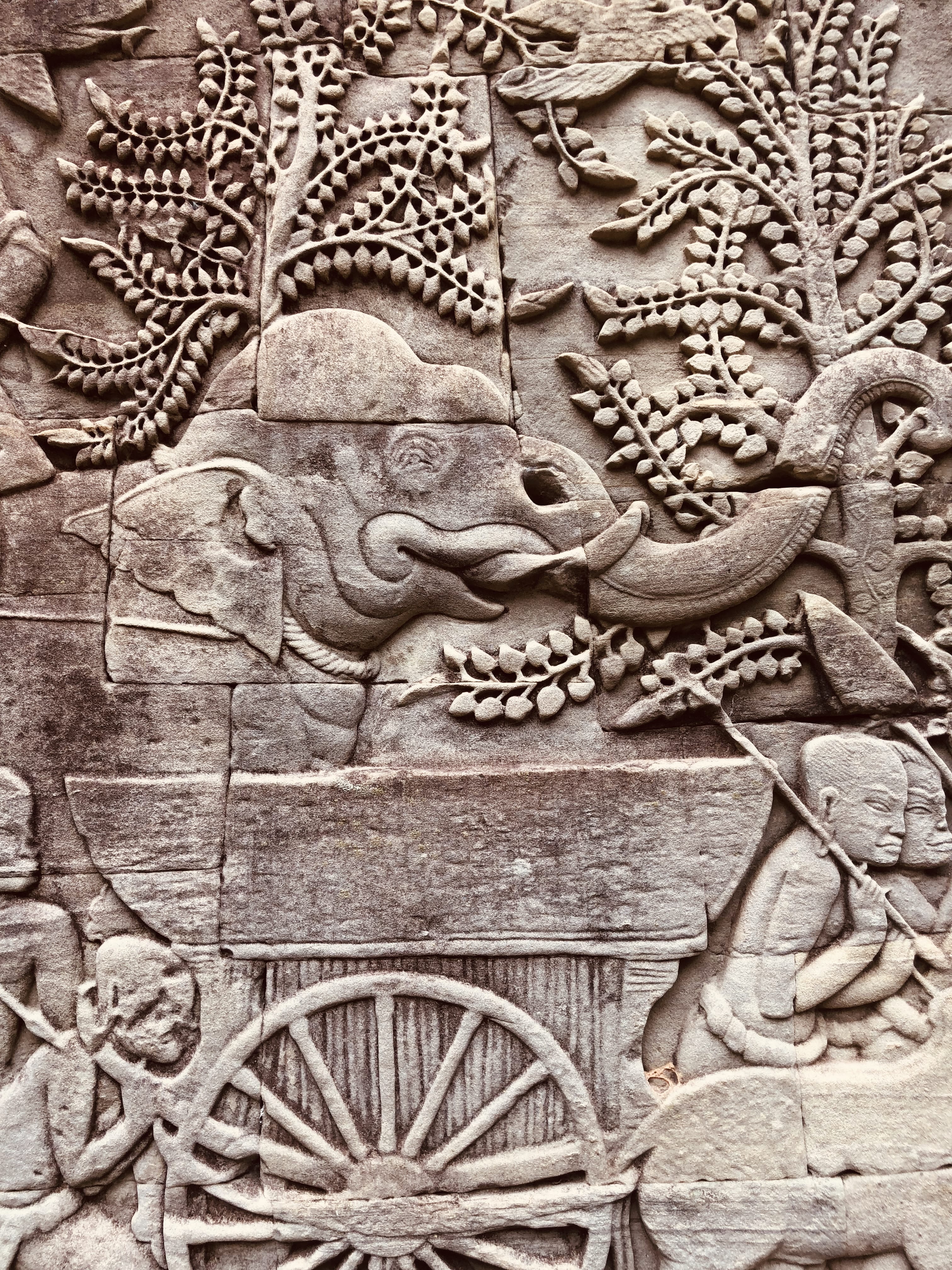 Inside Angkor Thom, the scale of everything stood out—crumbling walls, towering trees growing through the stone, and paths that seemed to go on forever. At the center is Bayon, which has over 200 stone faces carved into its towers. Each one has a calm, almost-knowing look. The walls are covered with carvings showing scenes from daily Khmer life, like markets and battles.