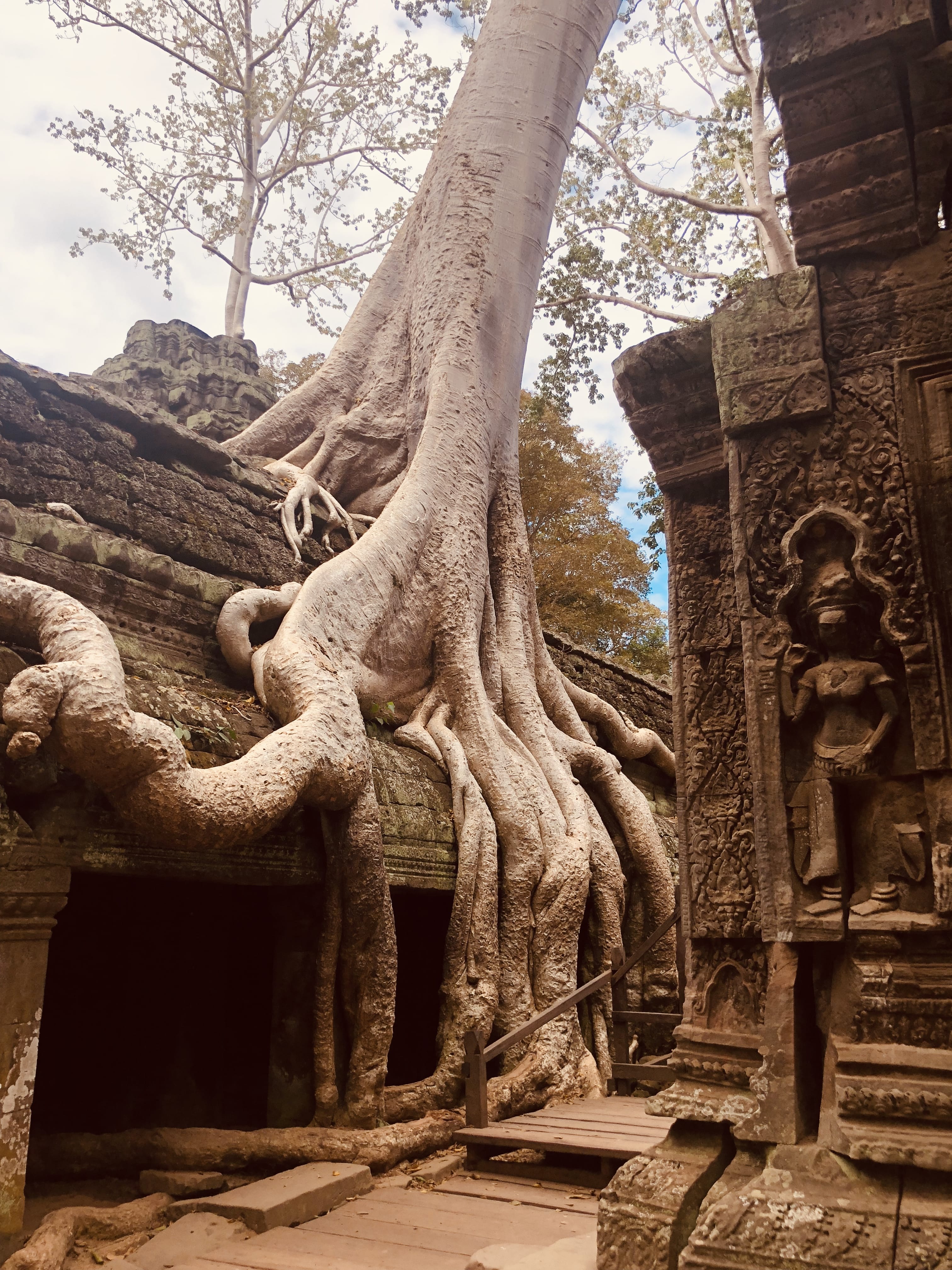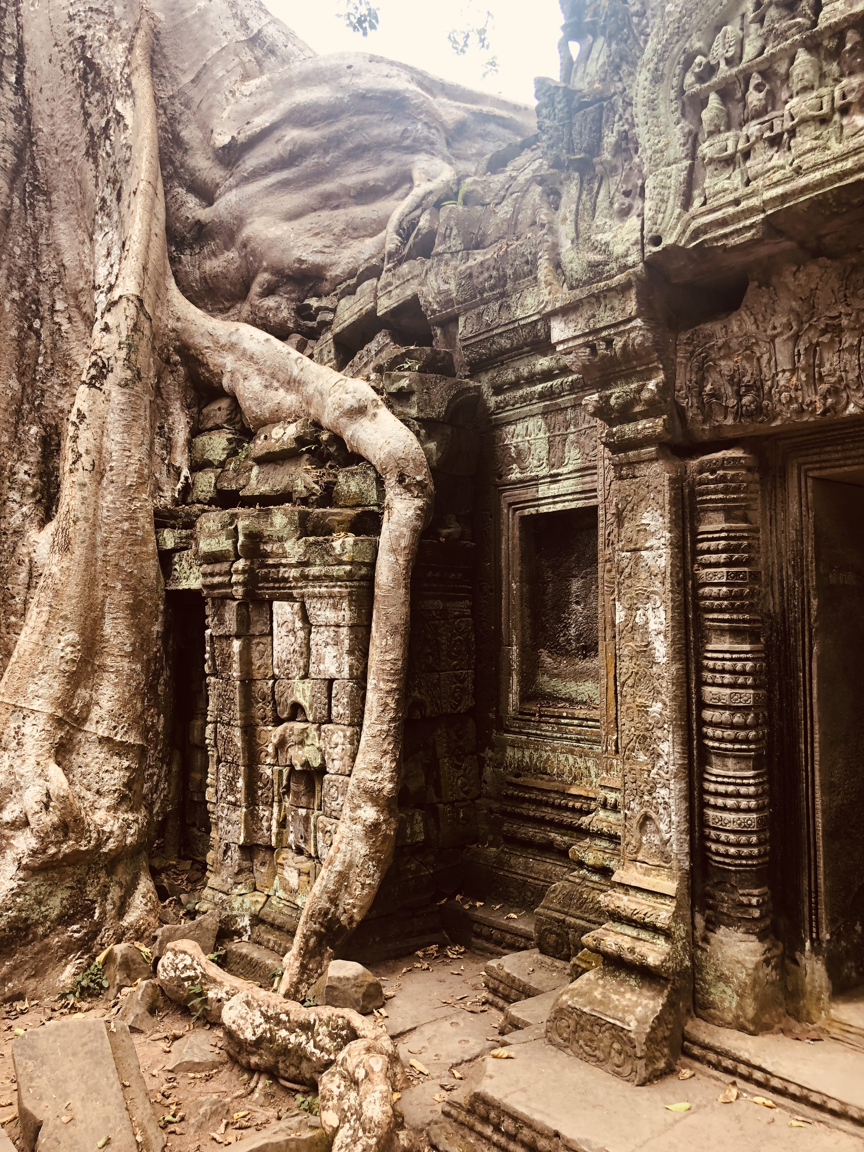 Next, we went to Ta Prohm, a temple outside of Angkor Thom’s city walls. Giant trees grow through the ruins here, their roots wrapping around the walls. The way the temple and trees have merged was both eerie and beautiful.