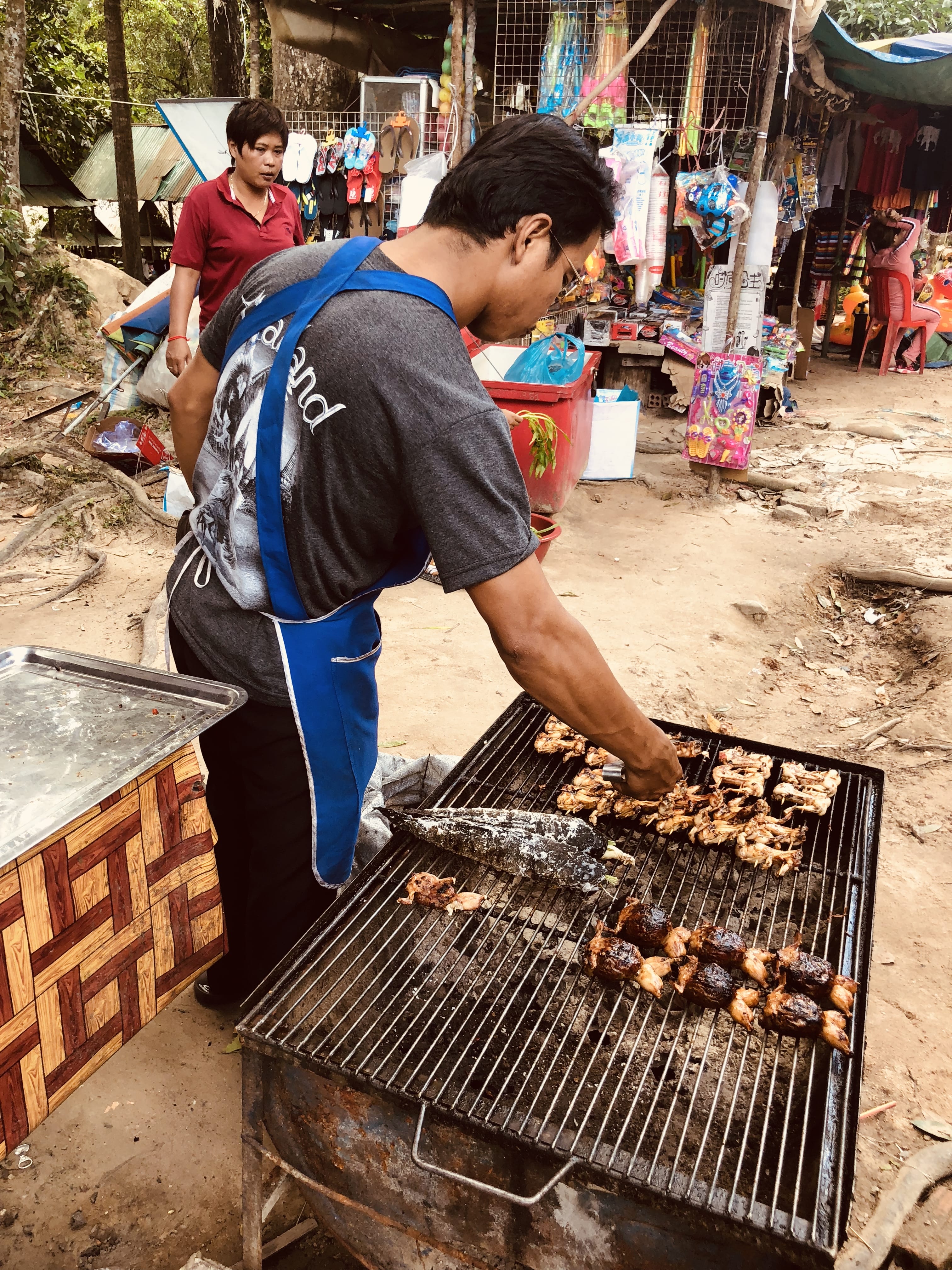 Eventually, we reached a large picnic area filled with activity. The path was lined with food vendors grilling frogs and fish, frying spring rolls, and making nom kong—deep-fried rice cakes shaped like doughnuts. The smoky smells filled the air.