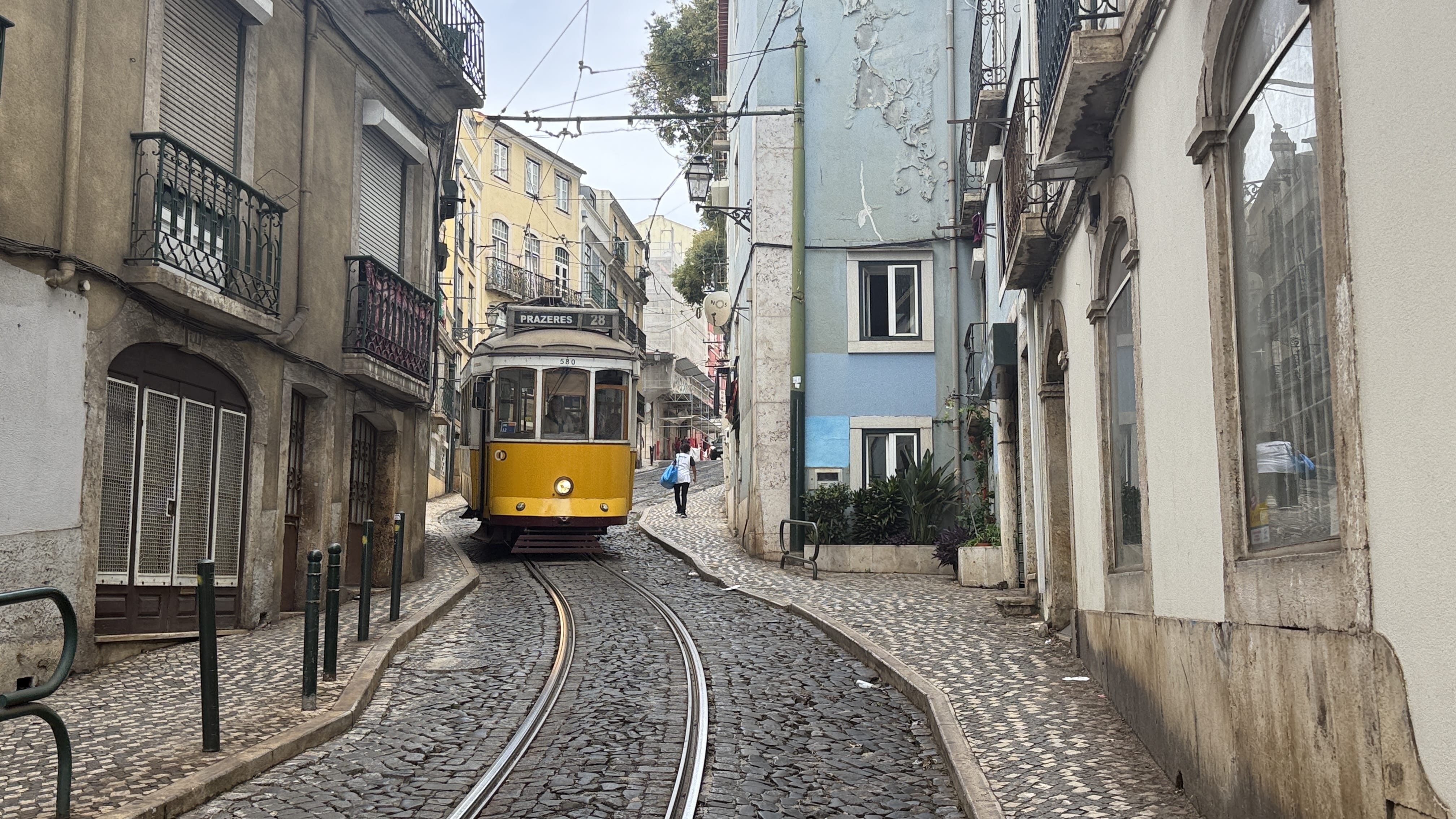 Outside, the famous Tram 28 rattled past, squeezing through impossibly narrow streets — pure Lisbon.