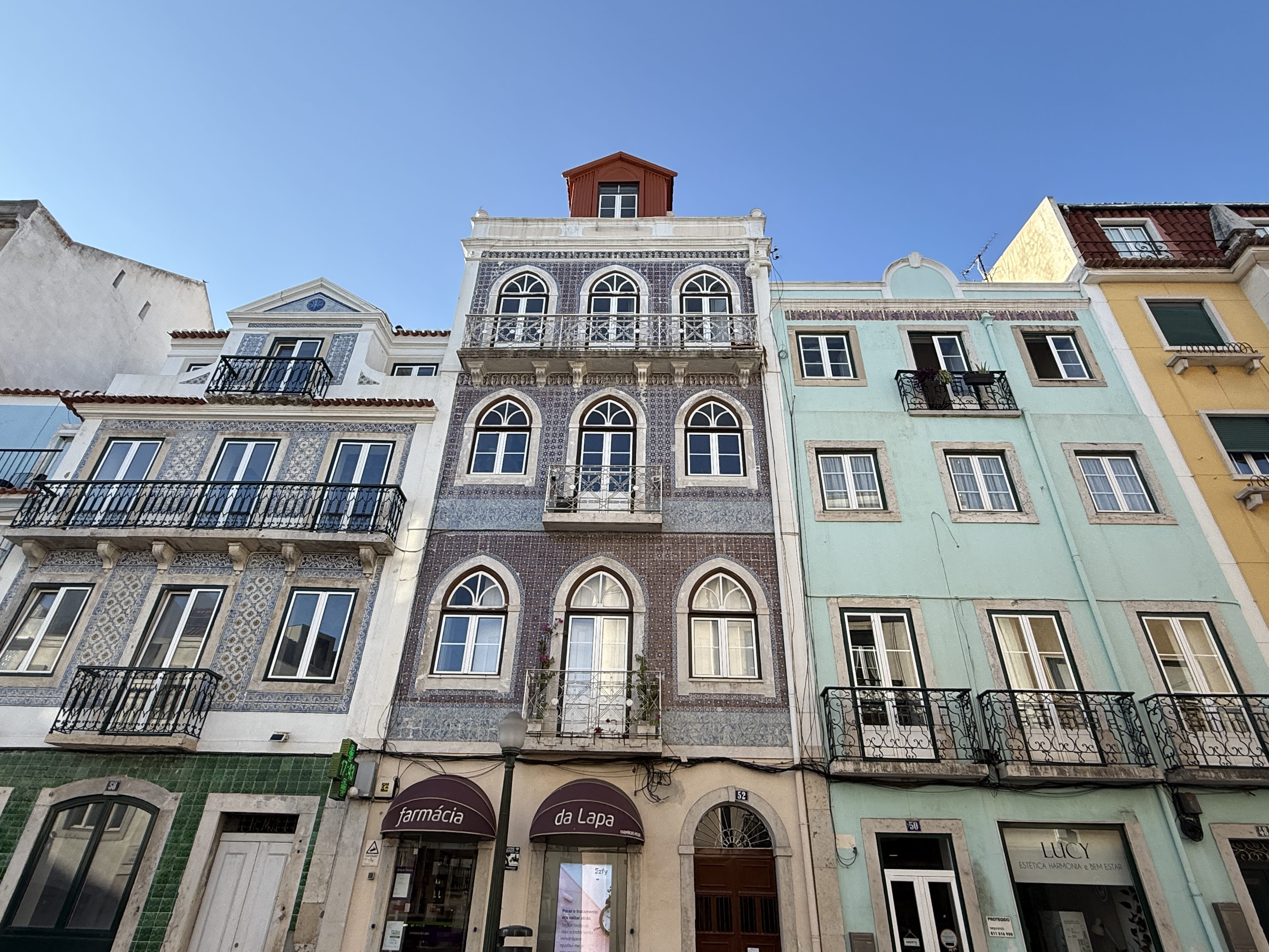 After lunch, I headed over to the Lapa neighborhood to see one of Lisbon’s most distinctive façades. Rather than being fully tiled, the decoration outlines the windows, doors, and roof in ornate 19th-century tilework — raised, colorful, and symbolic. The effect is dramatic, almost like a piece of architectural jewelry.