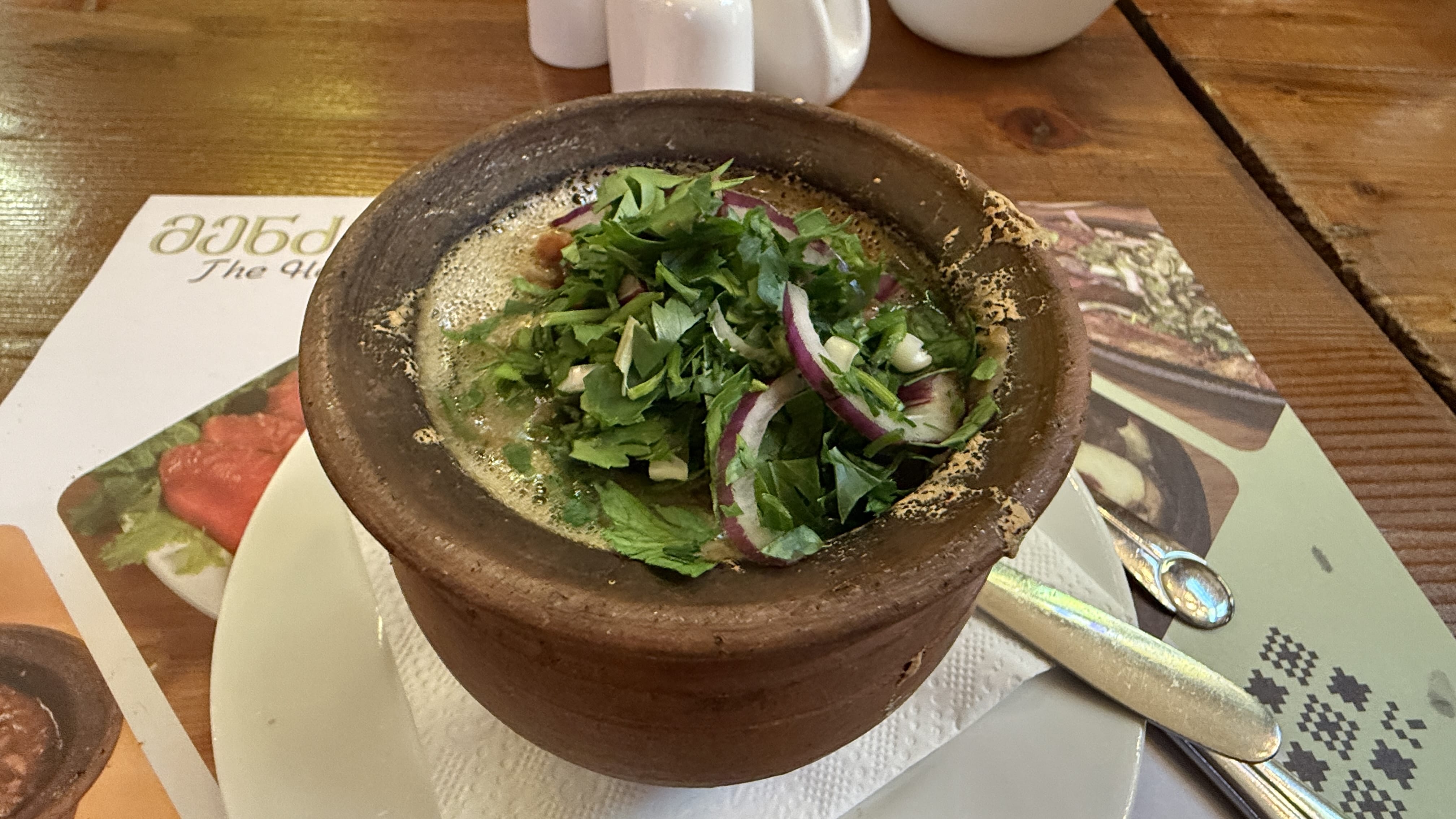 We continued to Zugdidi for lunch at Mednzeli. I ordered red beans in a clay pot and a glass of wine. One member of our group is a Catholic priest who always brought this really thick book to the table. I still don’t know how I managed it, but I knocked my wine straight onto his book — thank goodness it wasn’t the Bible.