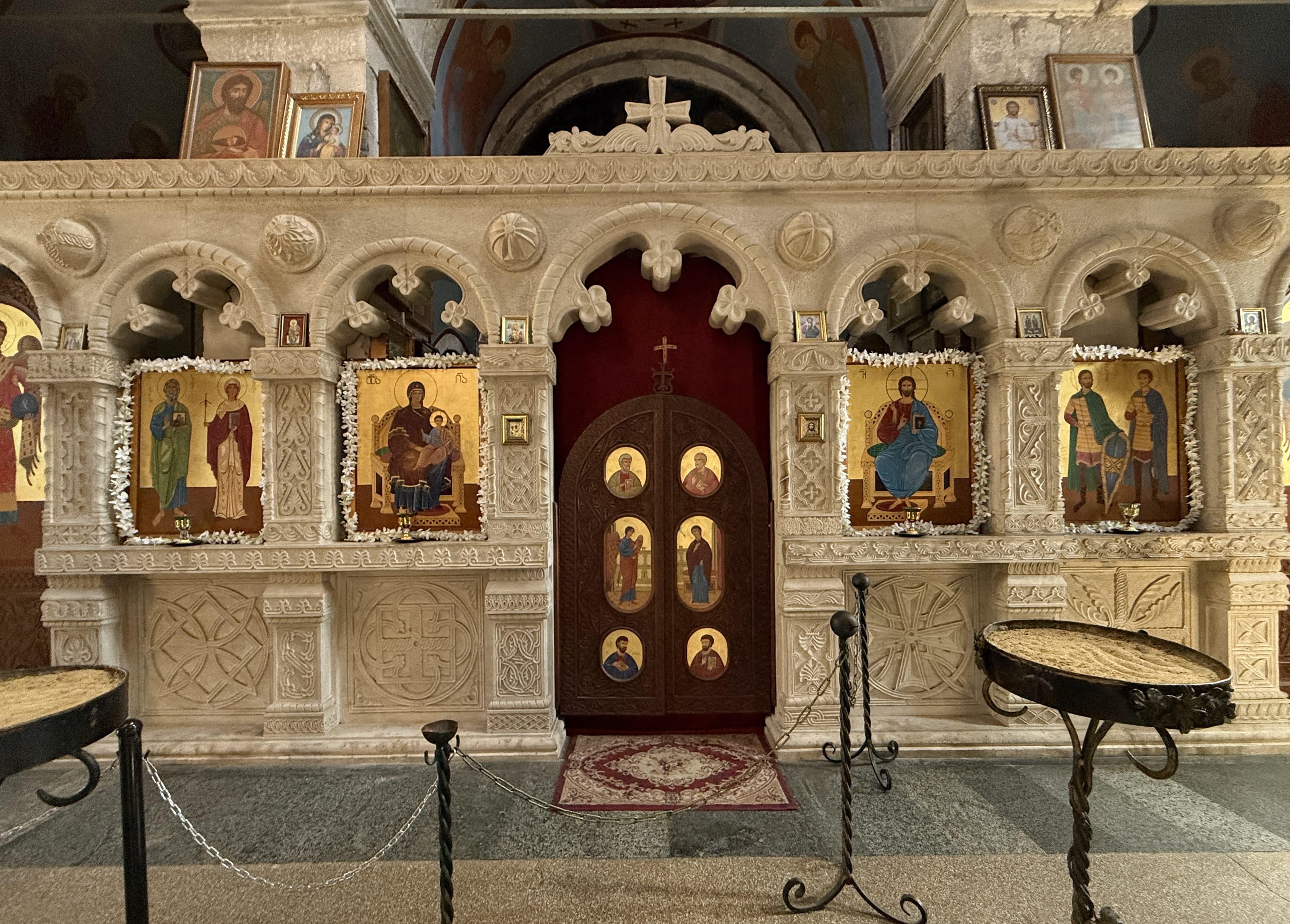 We visted Montsmeta Monastery, right after, and although it dates to the same period, the contrast was immediate — not just in size, but in purpose. Much smaller in scale, Motsameta is inward-focused. The carved stone iconostasis dominates the interior, a series of shallow arches filled with gold-ground icons and finely worked reliefs centered on a deep red doorway. From the courtyard, it’s easy to miss how exposed the setting really is; the monastery’s position above the gorge only becomes clear once you step back.