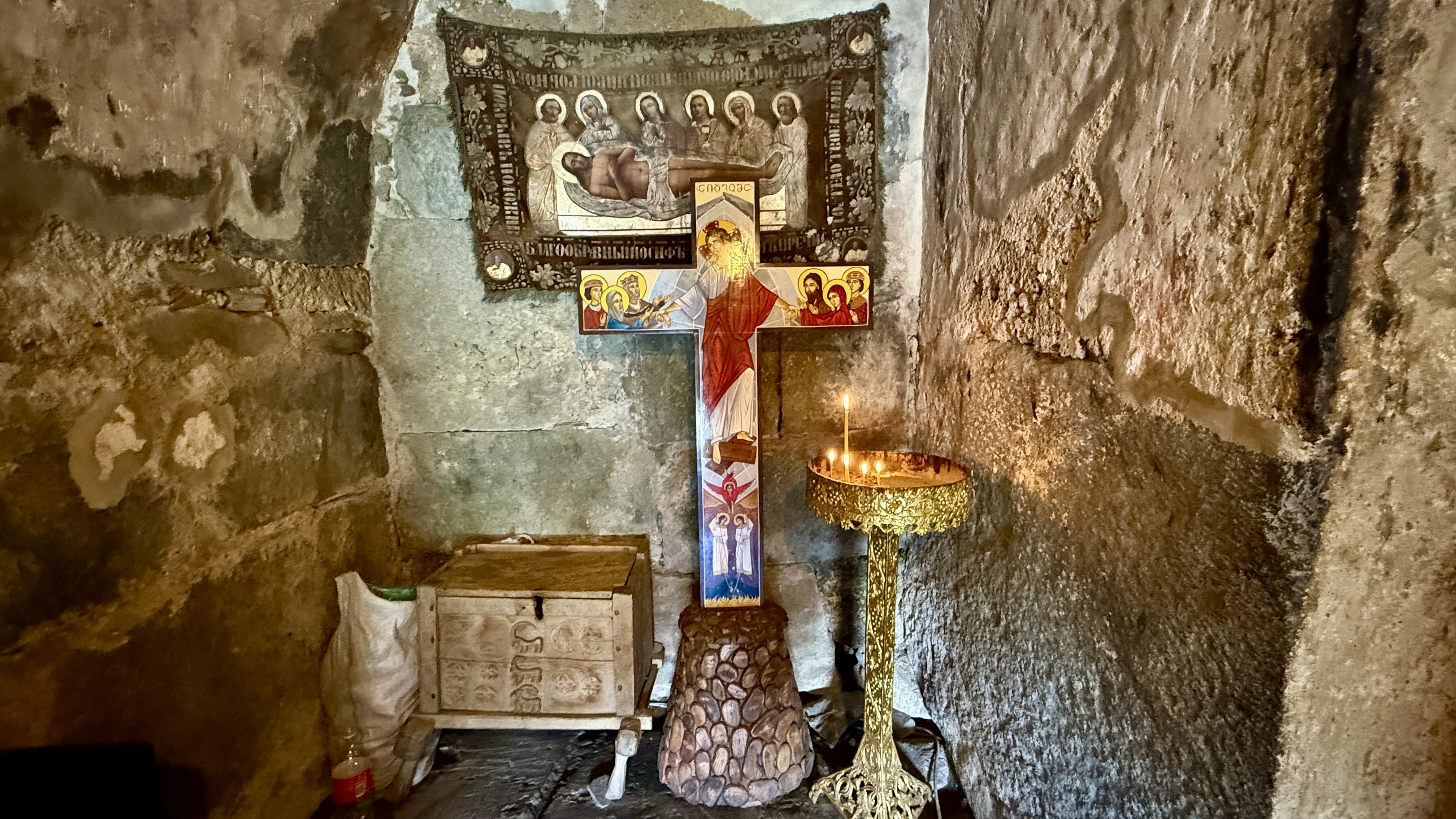 Ushguli has a few small churches scattered around the village. Lamaria Church — St. Mary — was open, so I went inside. The church is tiny and very old: uneven stones underfoot, frescoes fading into the walls, wooden icons, and two crowns sitting on a ledge by the altar. I lit a few candles for myself and a couple of people back home.