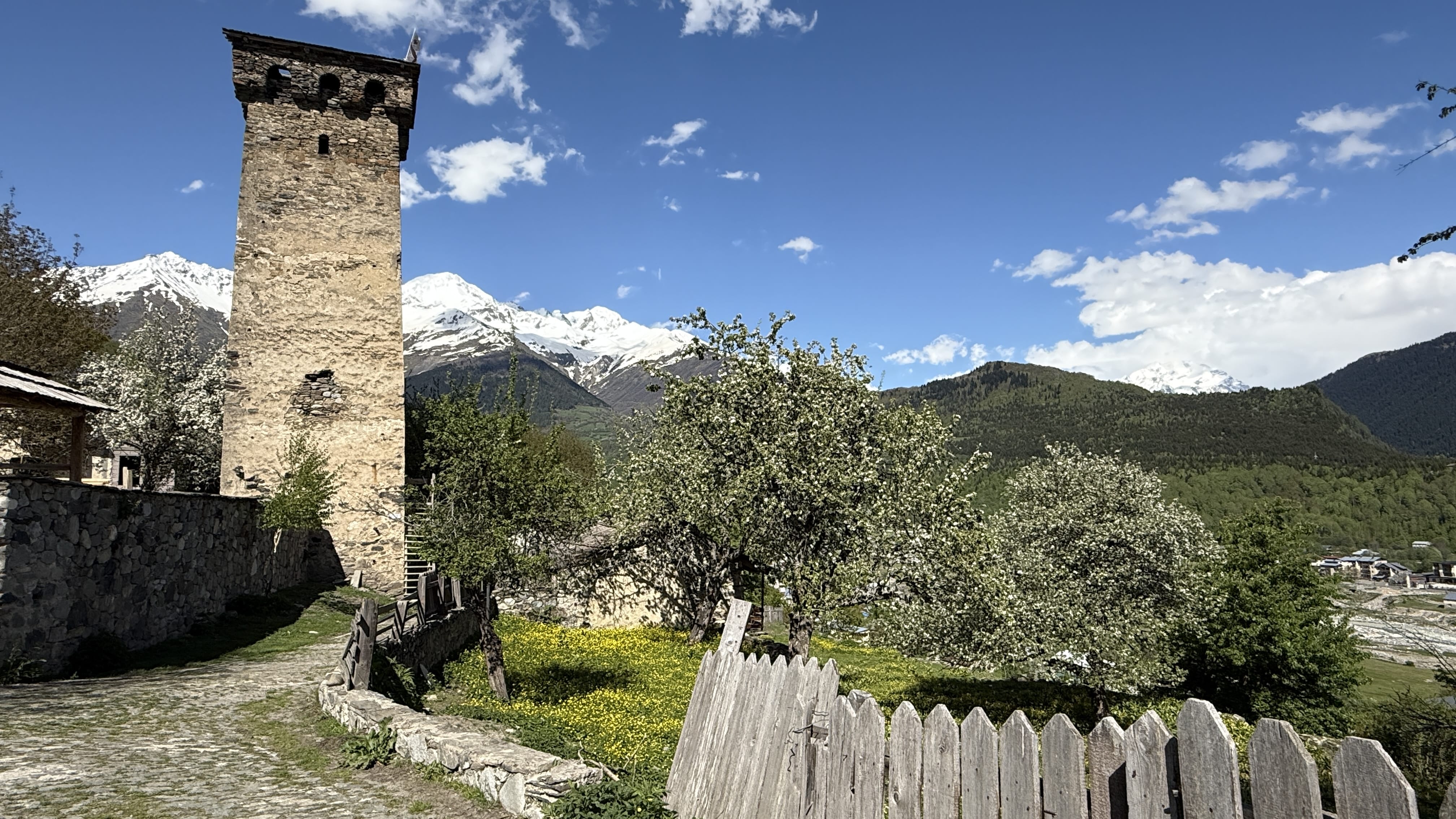 Spring in Svaneti — green valleys, snowy peaks.