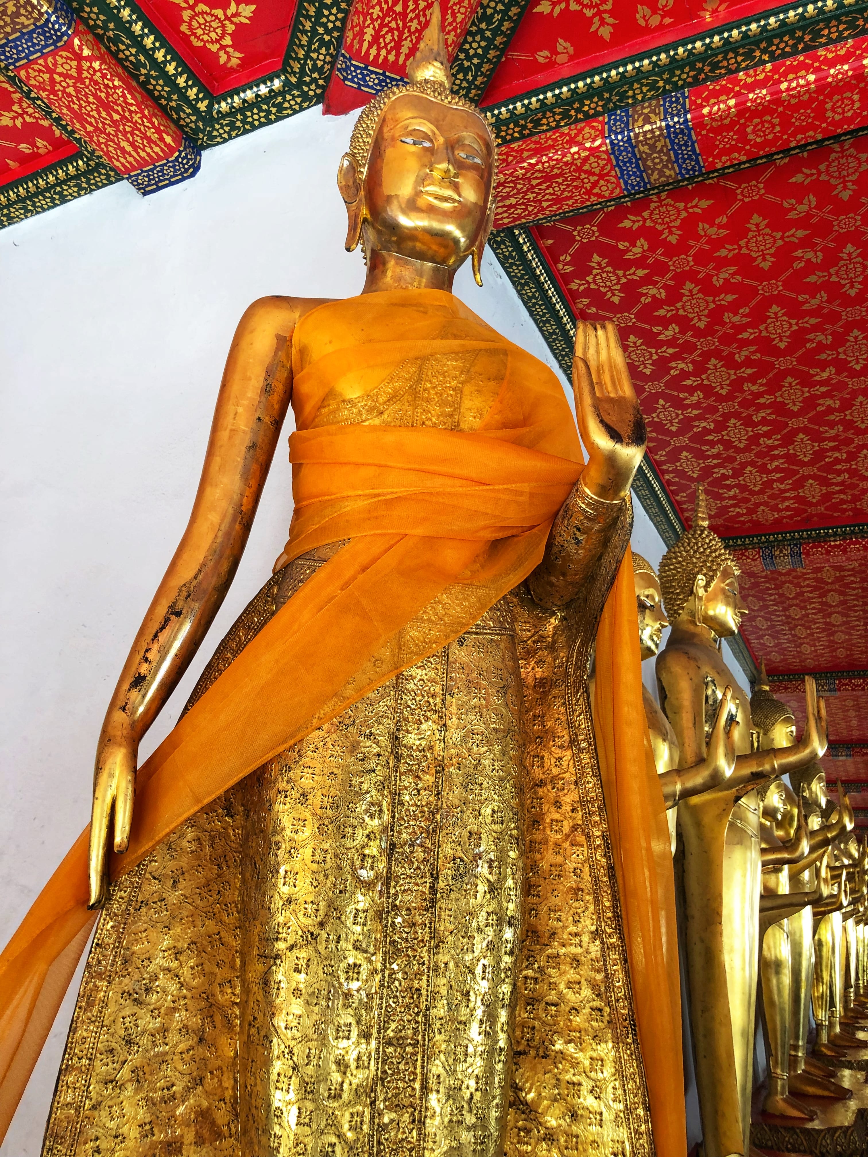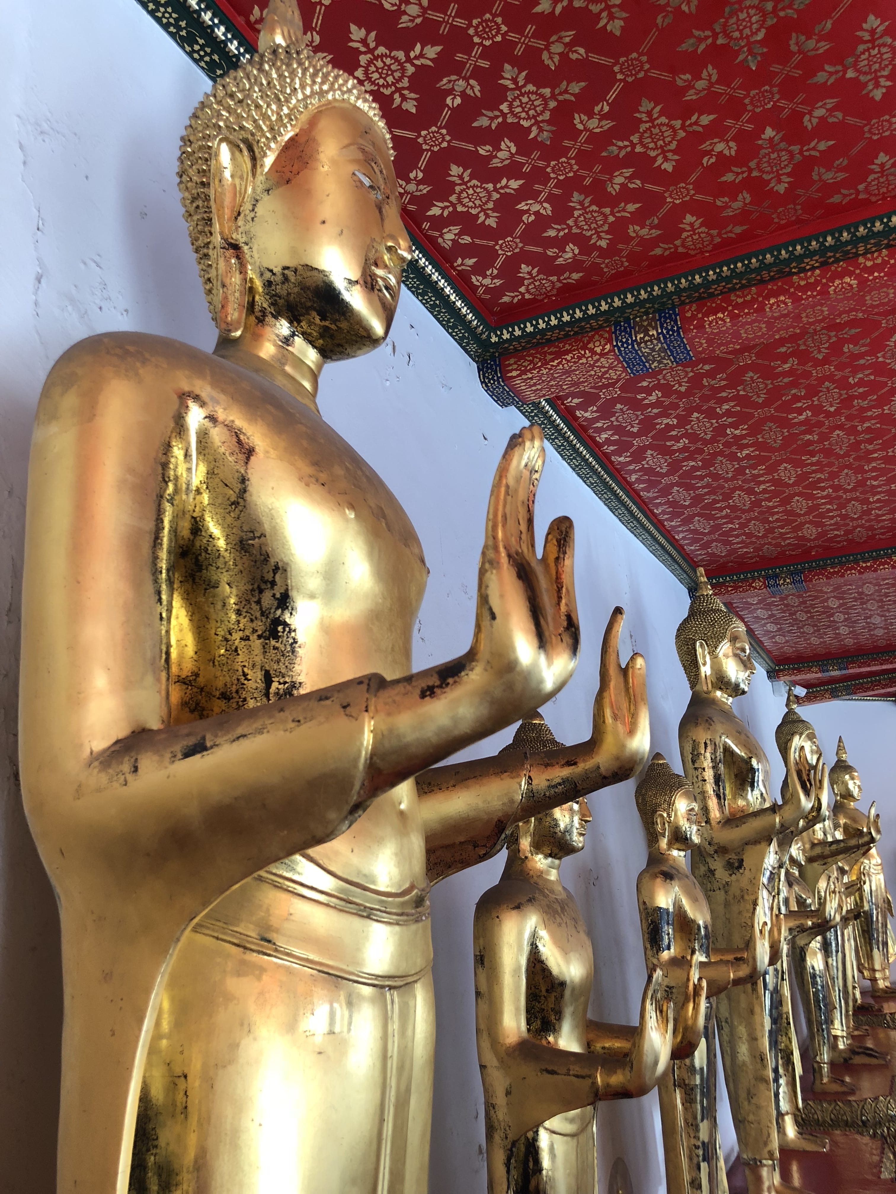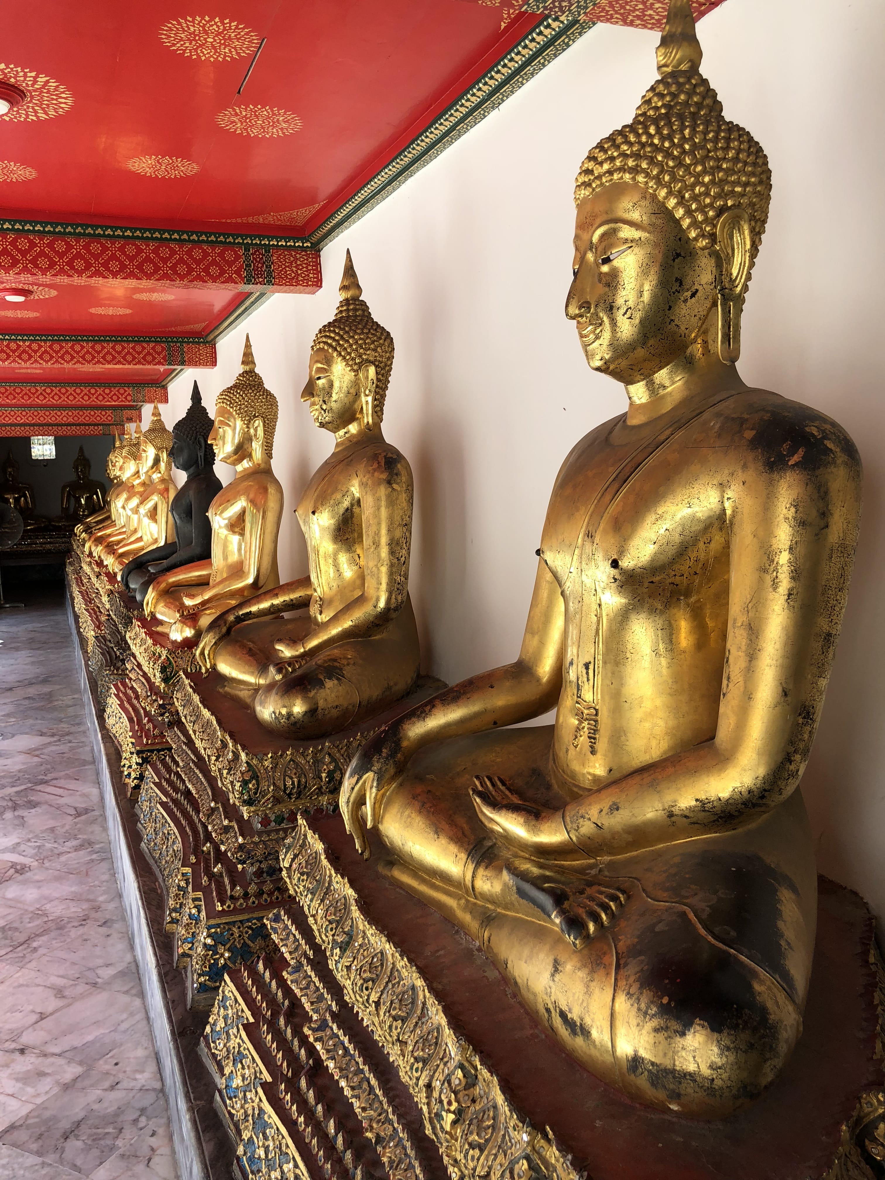 The walls lining the hall are covered with hundreds—maybe thousands—of small Buddha figures set into neat rows.