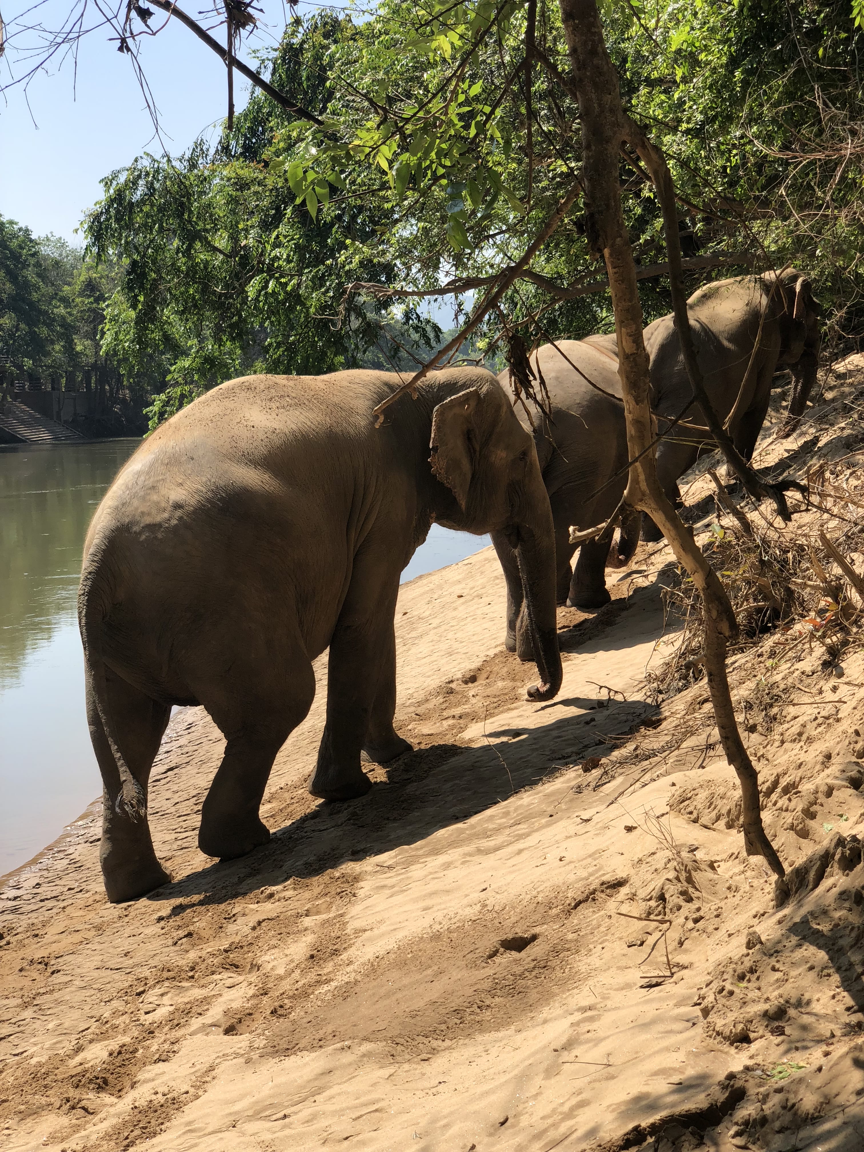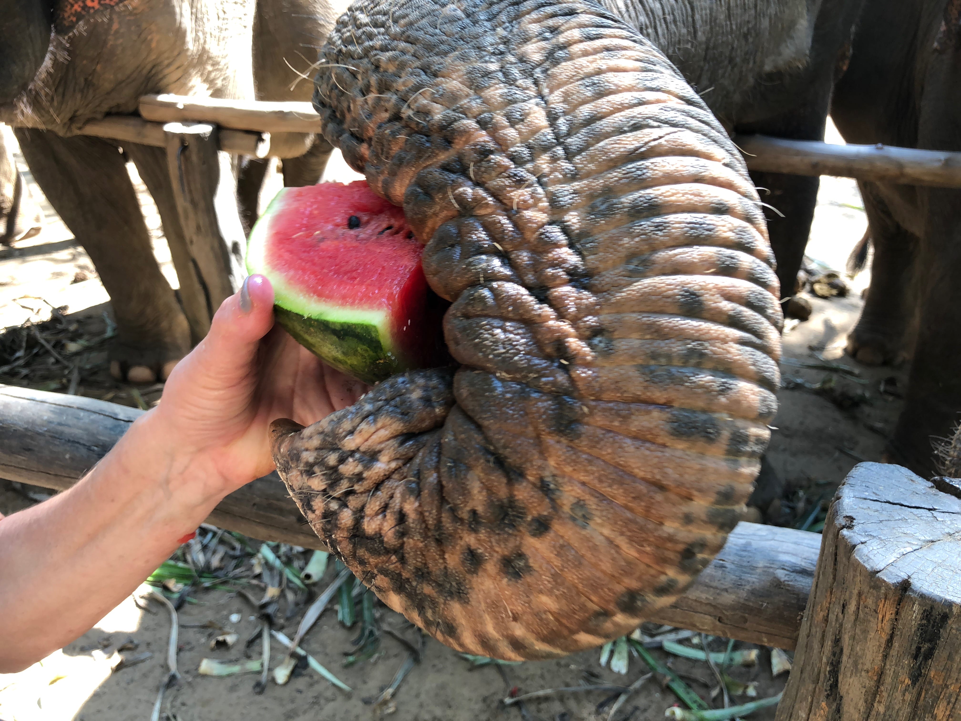 Later in the afternoon, we went down to the river so the elephants could bathe. Some lingered in the water, others coated themselves in mud, and a few wandered off entirely. Before leaving, we gave them bowls of watermelon slices, which they happily devoured.