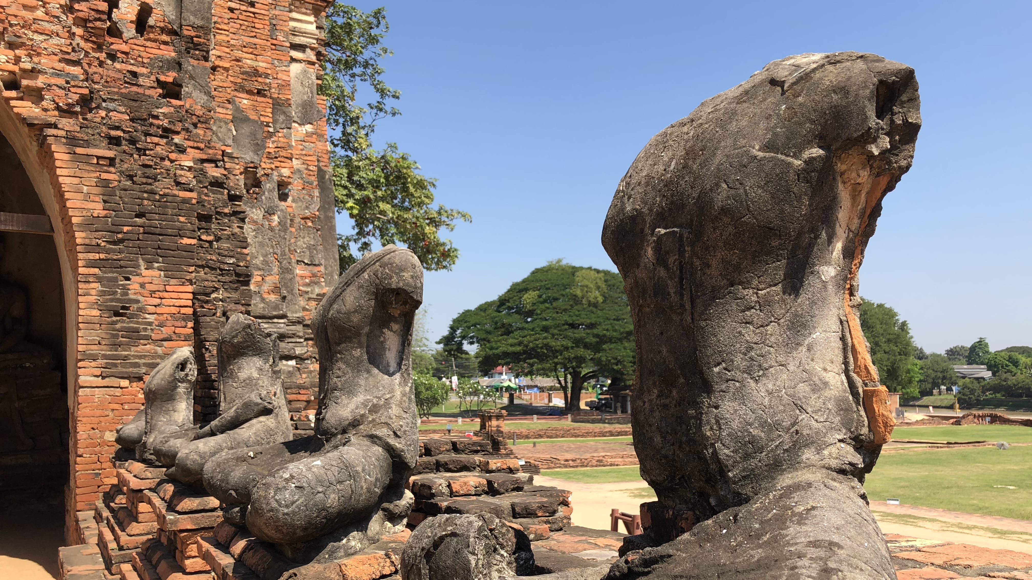 The damage is a quiet reminder of Ayutthaya’s violent past. When the city was sacked in the 18th century, many Buddha heads were destroyed or removed—sometimes as acts of war, sometimes later taken away. What remains is weathered brick and physical evidence of history left exactly as it is.