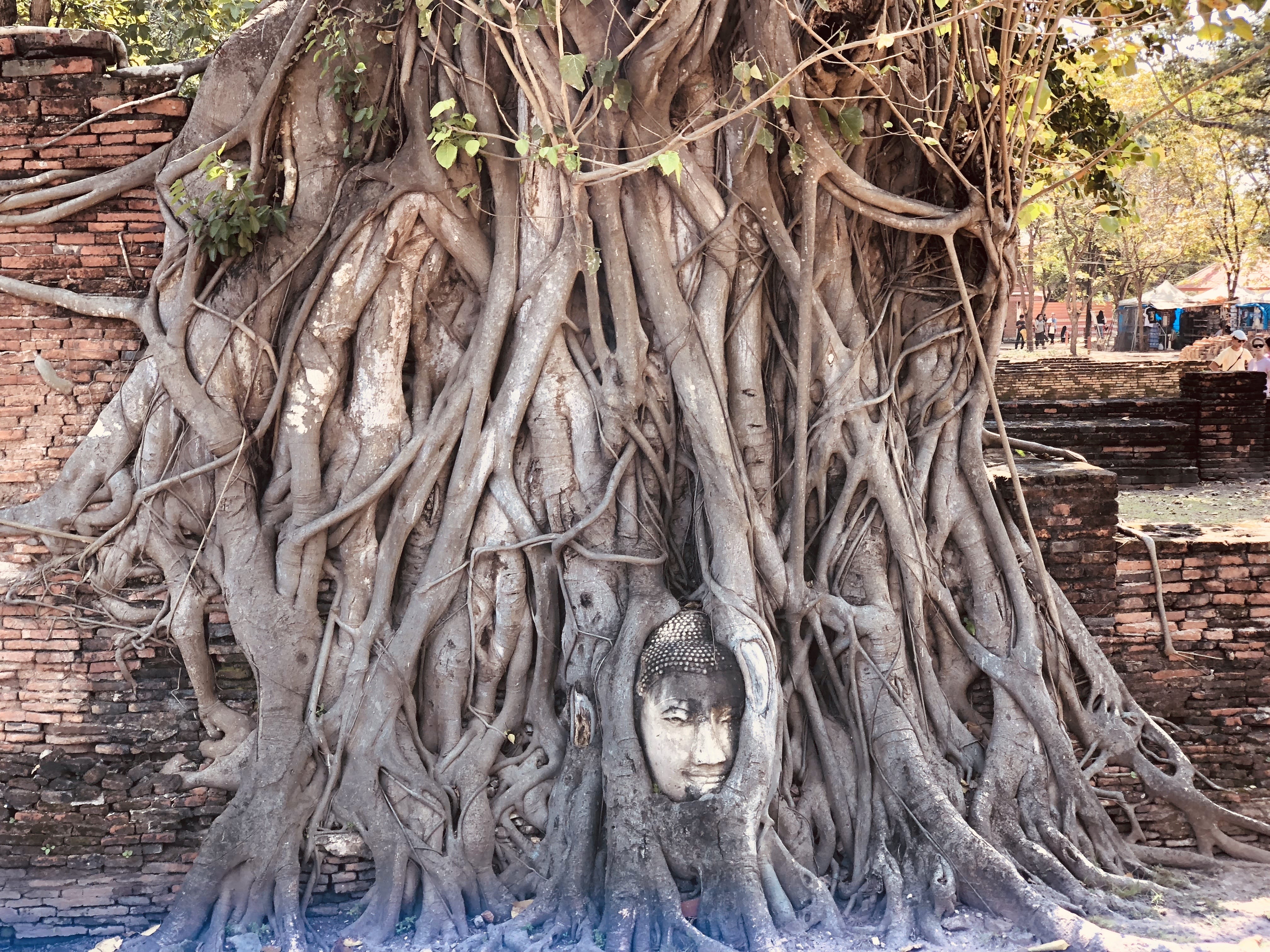 The detail everyone comes to see is the Buddha head entwined in the roots of a tree. Our guide pointed it out, and I’m glad he did—I might have missed it otherwise. Once you’ve seen it, though, you start noticing it everywhere: in photo books, postcards, and even framed on walls far outside Thailand. It’s become an image inseparable from Ayutthaya itself.