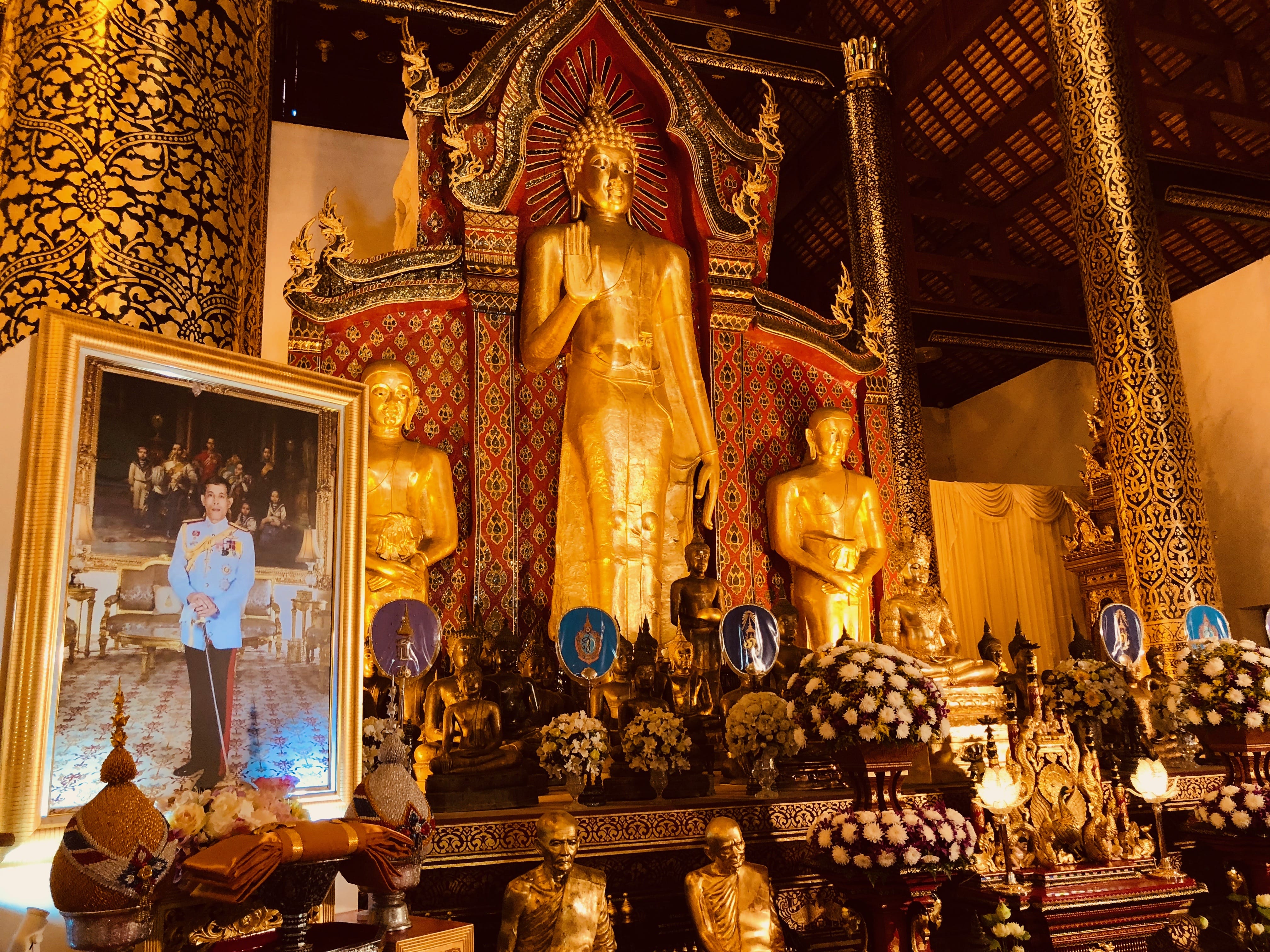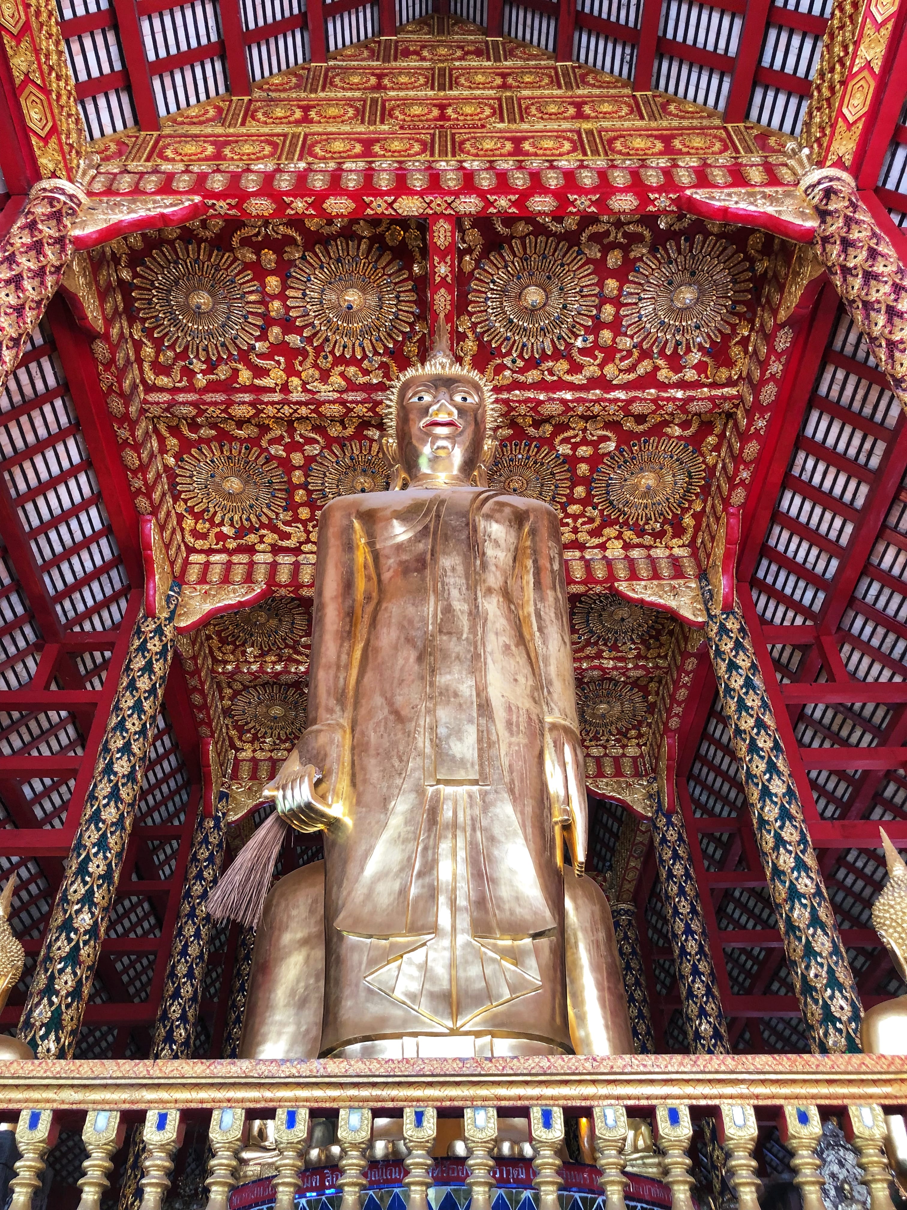 Later, we visited Wat Phra Singh Woramahawihan, another distinct complex known for its richly decorated interiors and important Buddha images. Inside, the space is filled with gold—a seated Buddha, a large standing figure, and a jade Buddha—all set within intricately painted and carved halls.