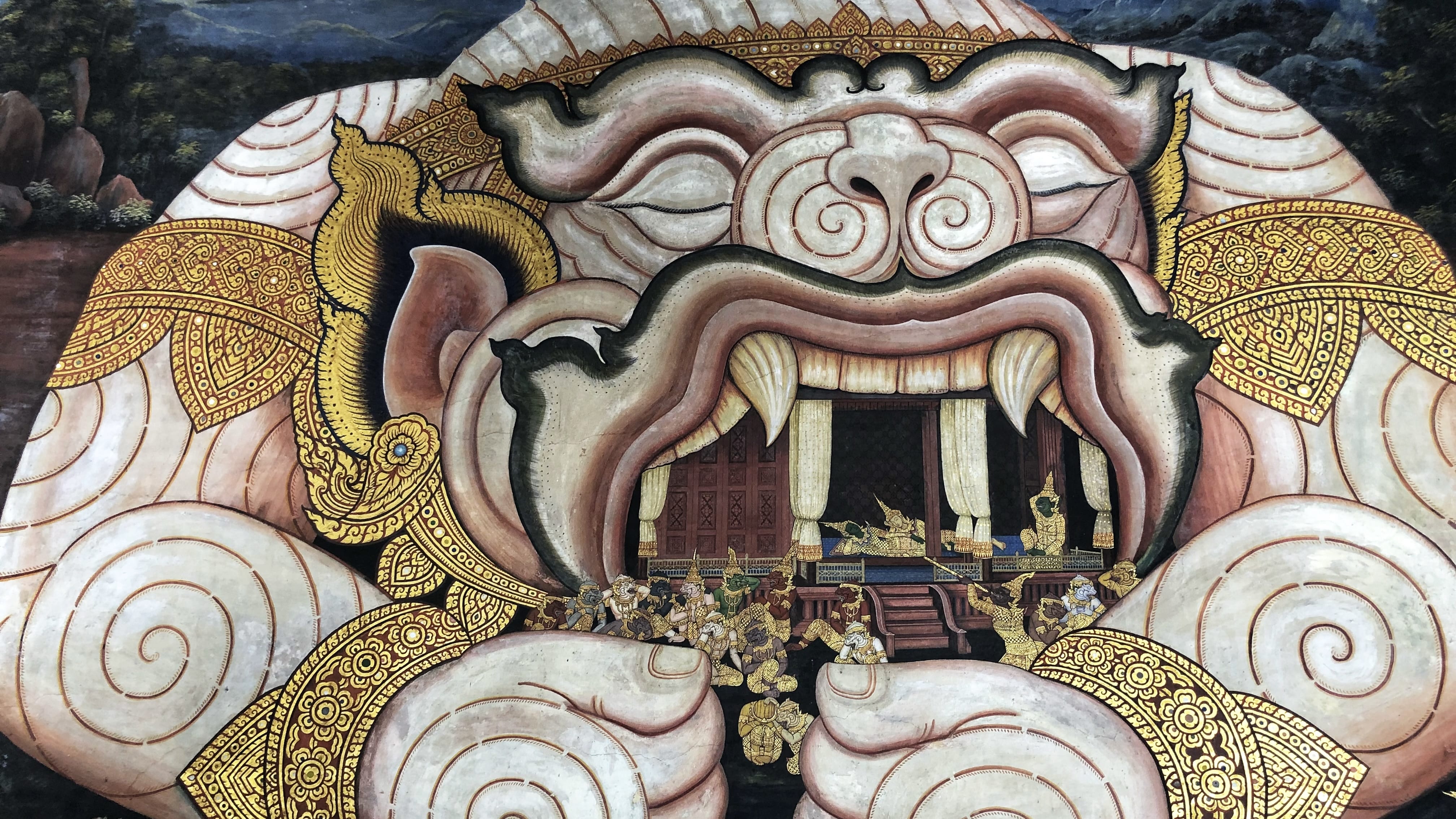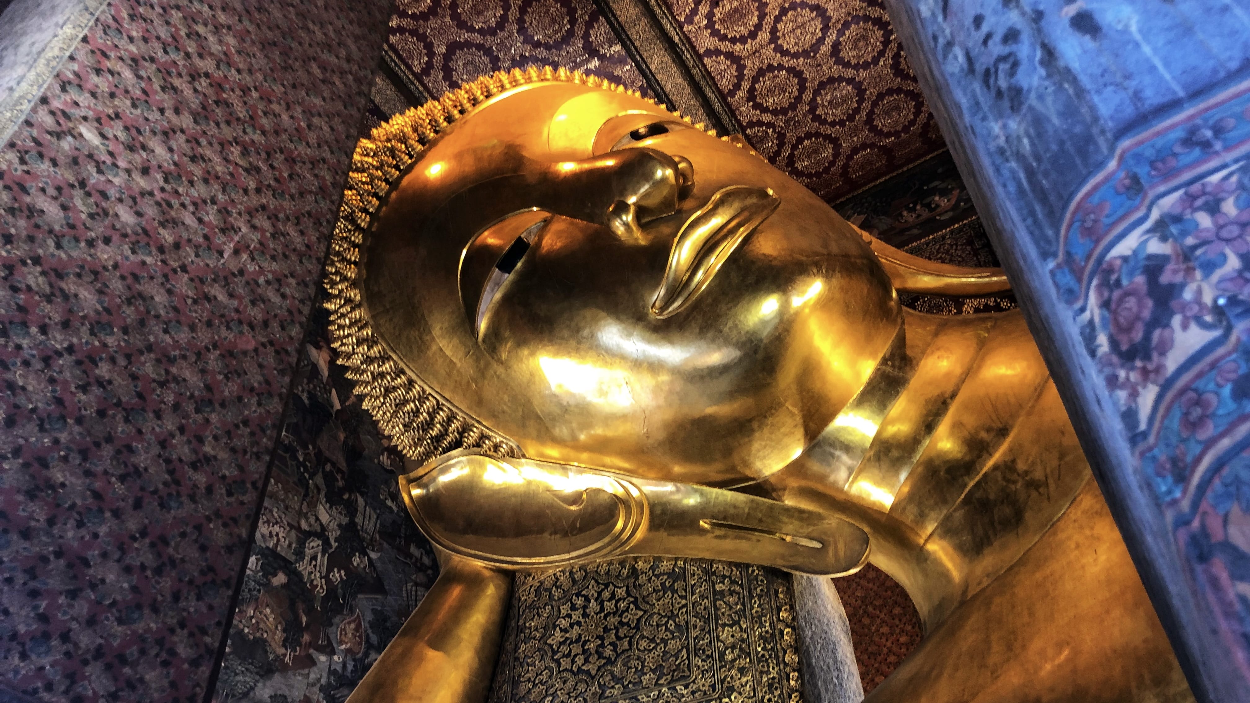 The statue is massive—completely covered in gold and so long you have to keep moving to take it all in. The face has a calm, peaceful expression, and the soles of the feet are decorated with intricate mother-of-pearl designs that make you stop and stare. As impressive as the Buddha is, the room itself is just as striking, with walls covered in murals depicting scenes from Buddhist teachings and cosmology, packed with detail in every direction.