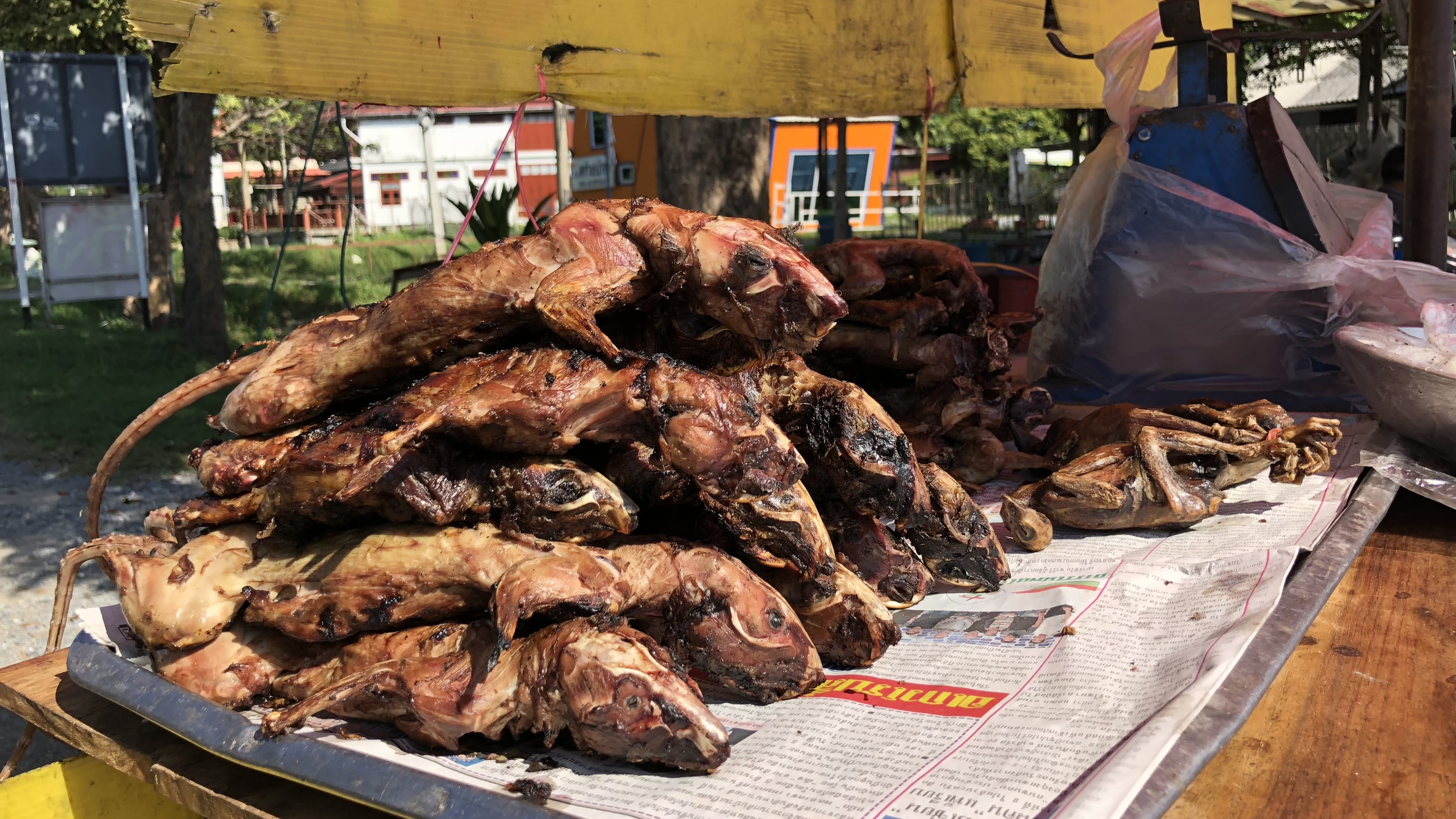 After breakfast at the hotel, we headed to Ayutthaya, making a brief stop along the way to see one of the largest reclining Buddha images in the area. Something unexpected that caught my eye during the drive were roadside stands selling grilled rats—apparently a fairly popular local food in this region.