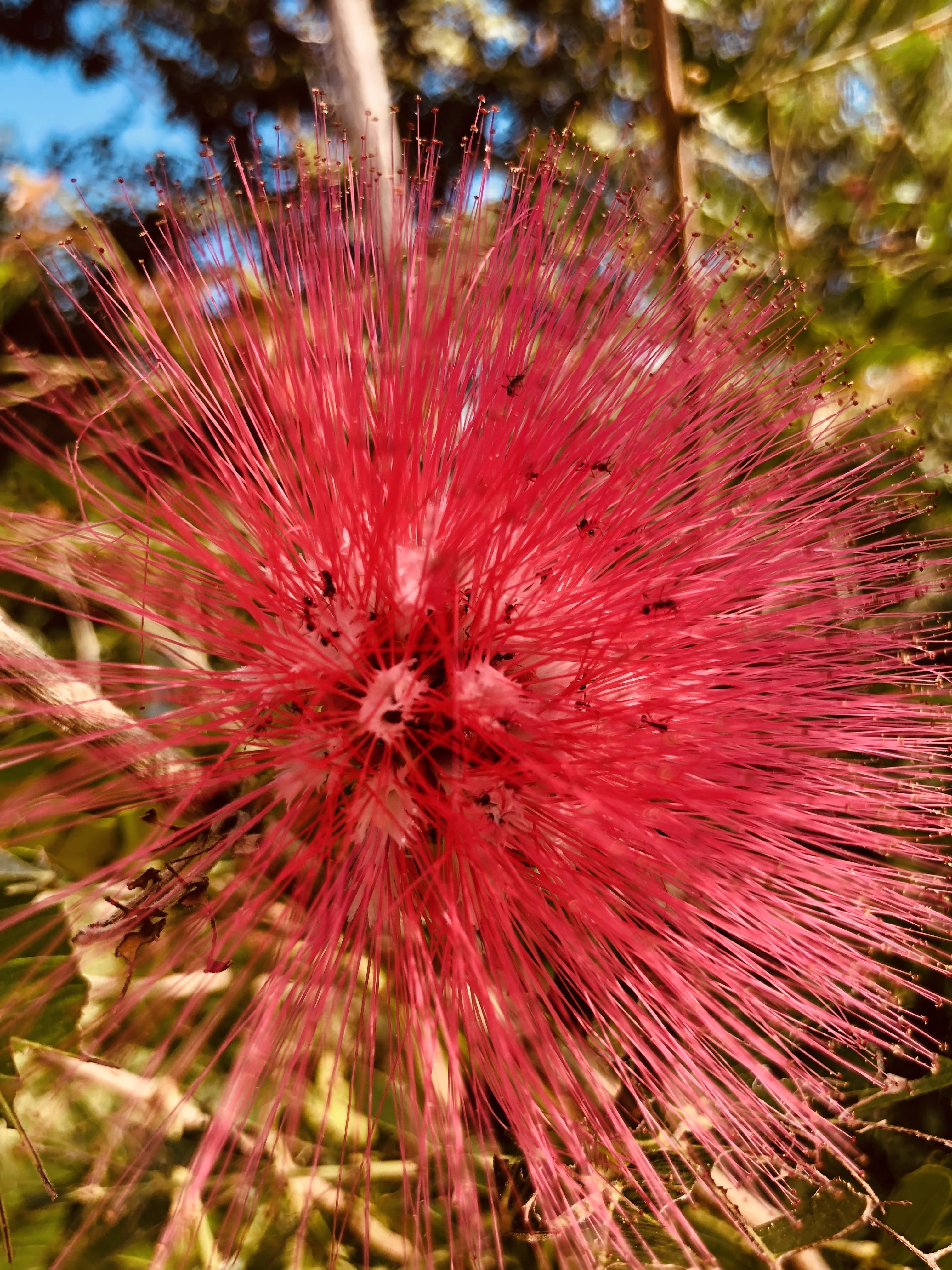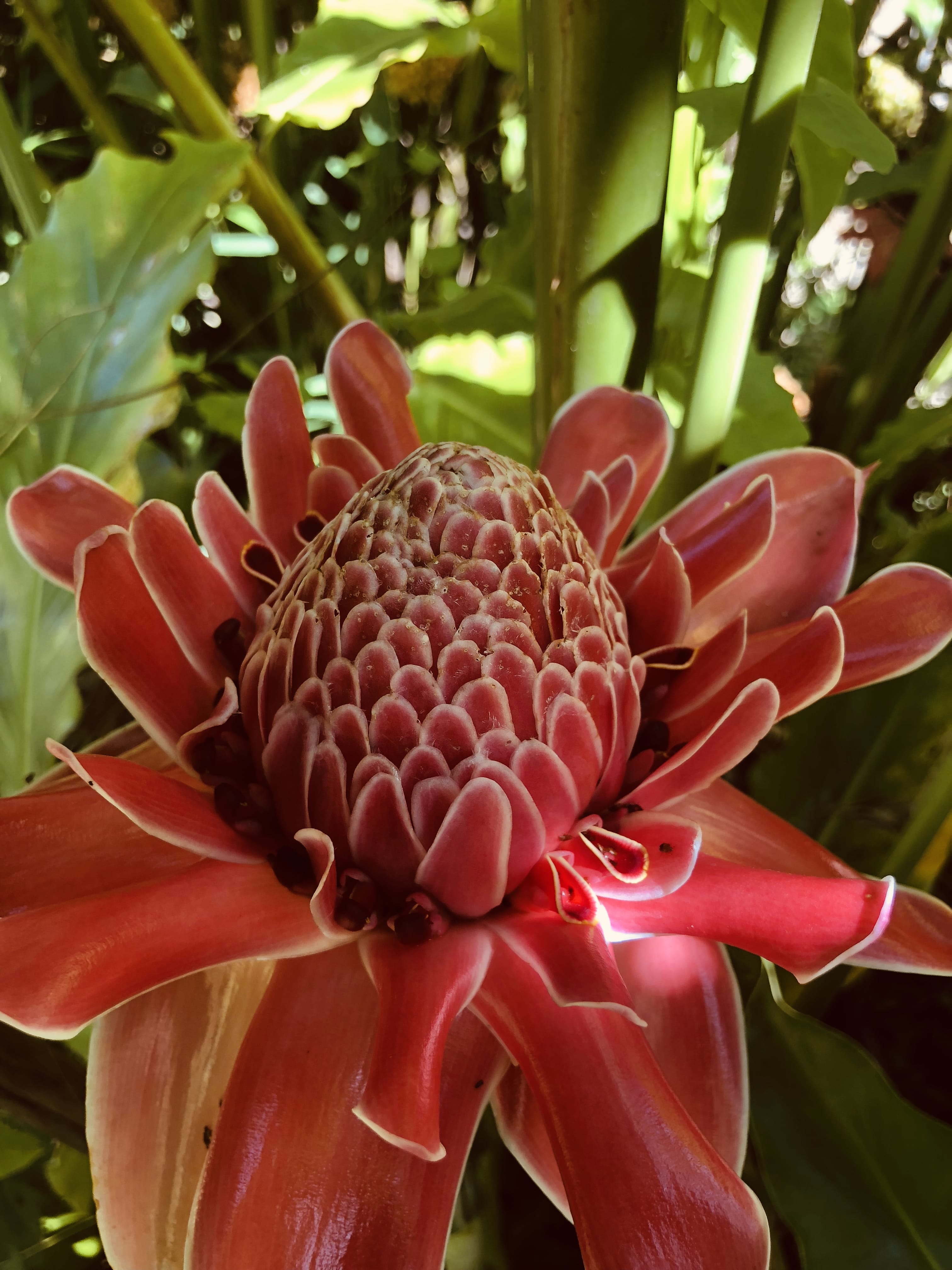 After spending some time feeding the elephants and observing them, we met our hiking guide for the Mae Wang Waterfall Trail. The hike was a few hours long, following a dirt path through dense greenery. Along the way we passed banana trees, poinsettia-like plants with deep pink leaves, bright red powder-puff flowers, wild ginger, shelf fungi clinging to fallen logs, and other tropical plants I couldn’t name . The trail was nicely shaded and quiet—the highlight was reaching the waterfall.