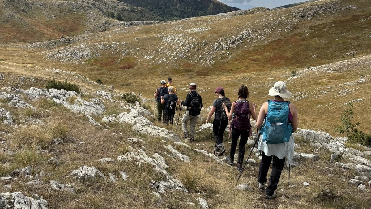 Later, we drove to another part of the range, near a cluster of old stone katuns—seasonal herder huts scattered across the open hills. The wind had really picked up by then, but we set out on a gradual climb through grassland and rocky slopes—nothing technical—just a steady uphill walk with big views and strong gusts the whole way.