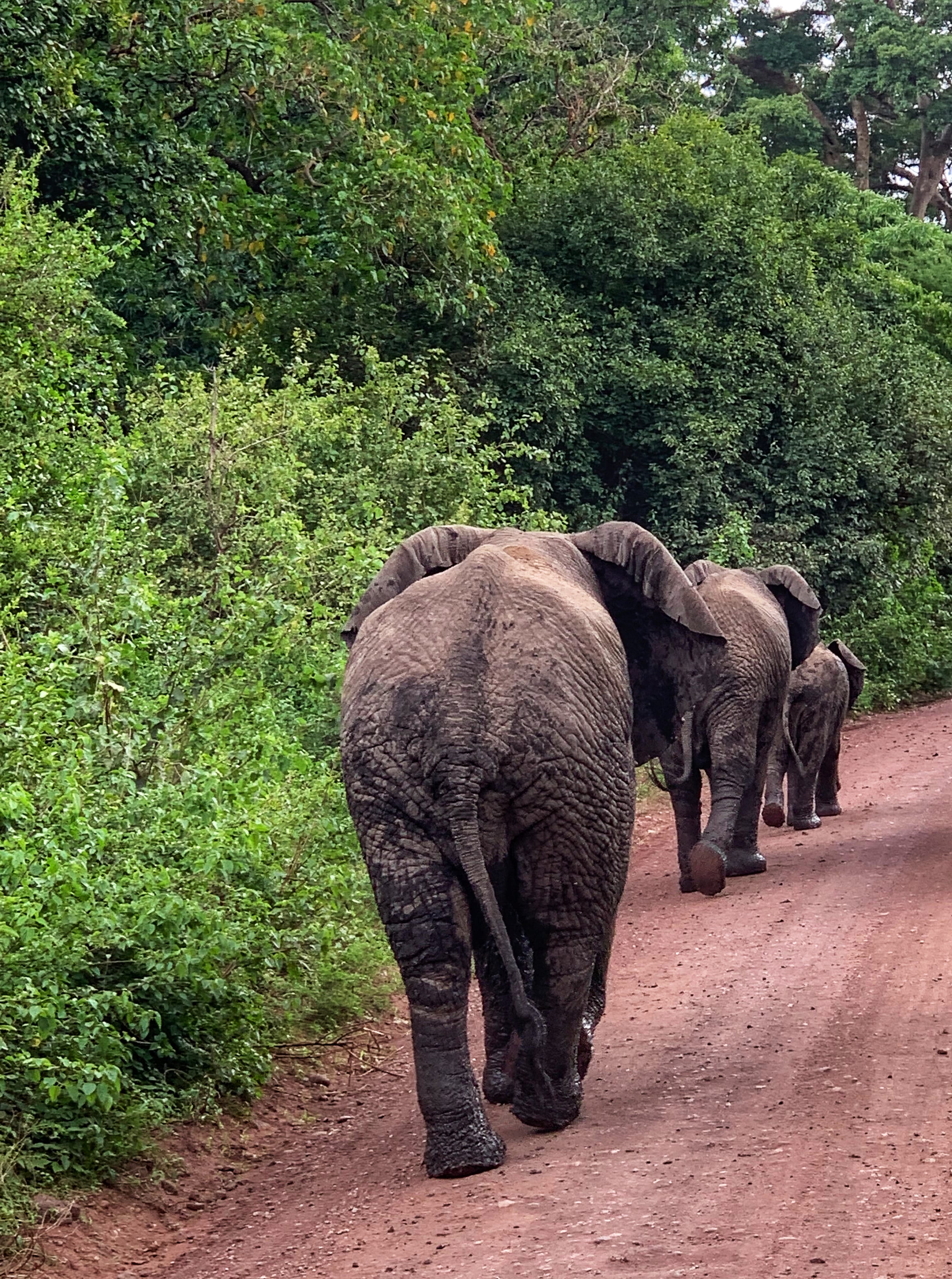 Watching a herd of elephants slowly take over the road.