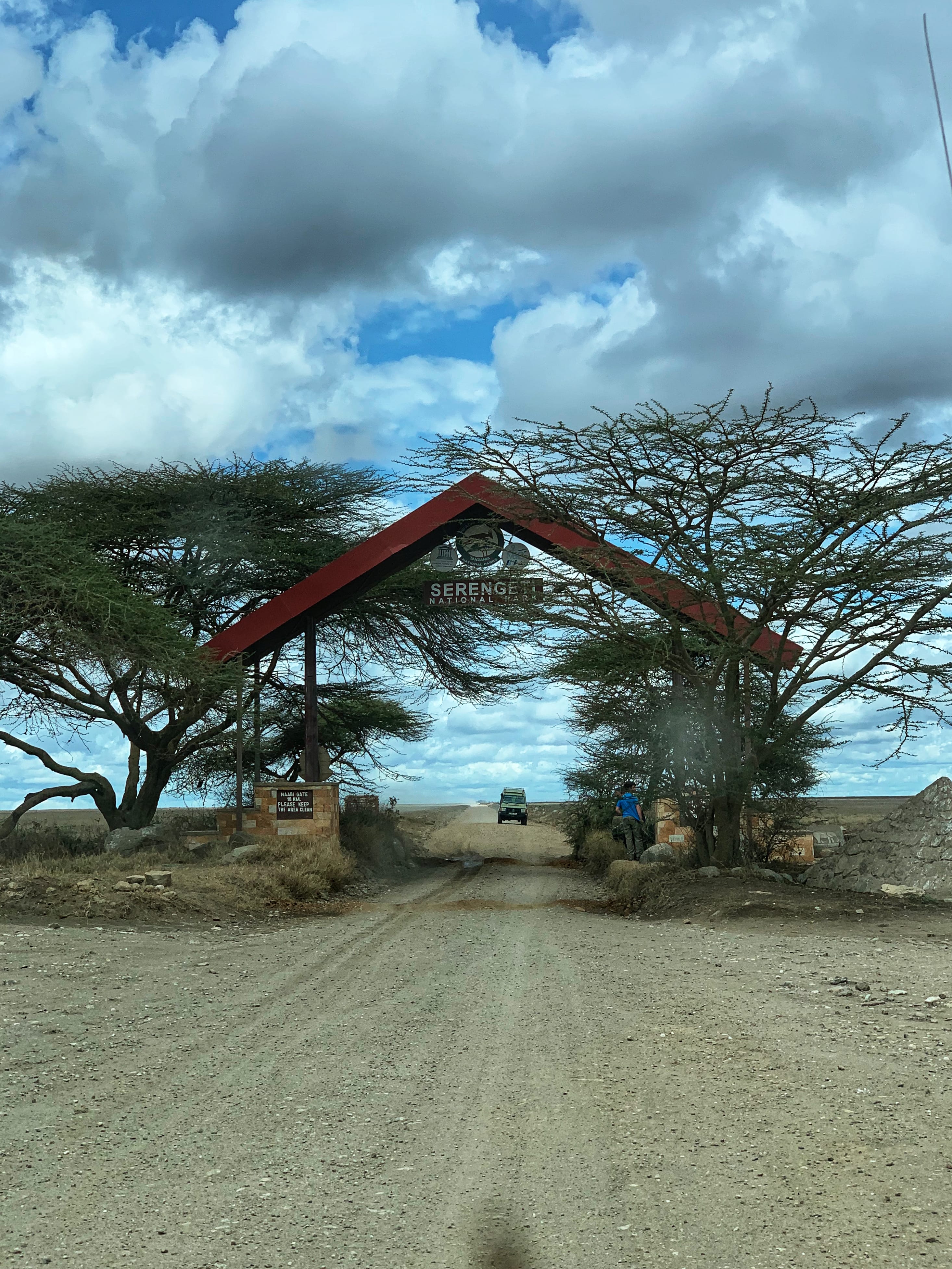From Olduvai, the road dipped and stretched into flatter plains, and soon we were passing herds of grazing zebra scattered across the grasslands. A little farther on, we reached the green entrance gate to Serengeti National Park.