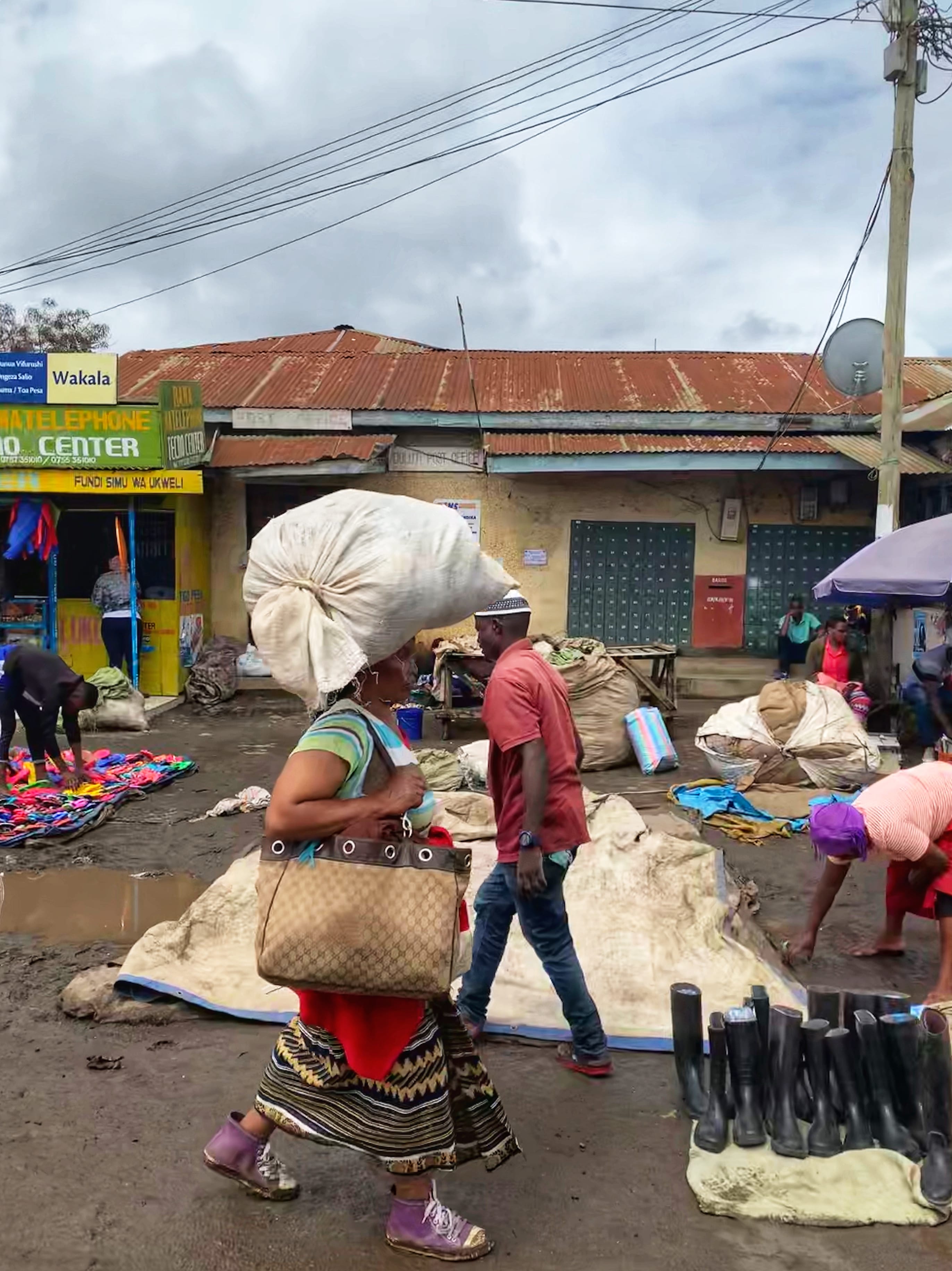 The drive from Kilimanjaro International Airport to our lodging—the Arusha Serena Hotel—took about 50 minutes. Along the way, we passed an open street market—rows of clothes spread out on the ground, produce piled high, and women in bright, patterned kangas and kitenges moving through the market with huge bundles balanced on their heads.