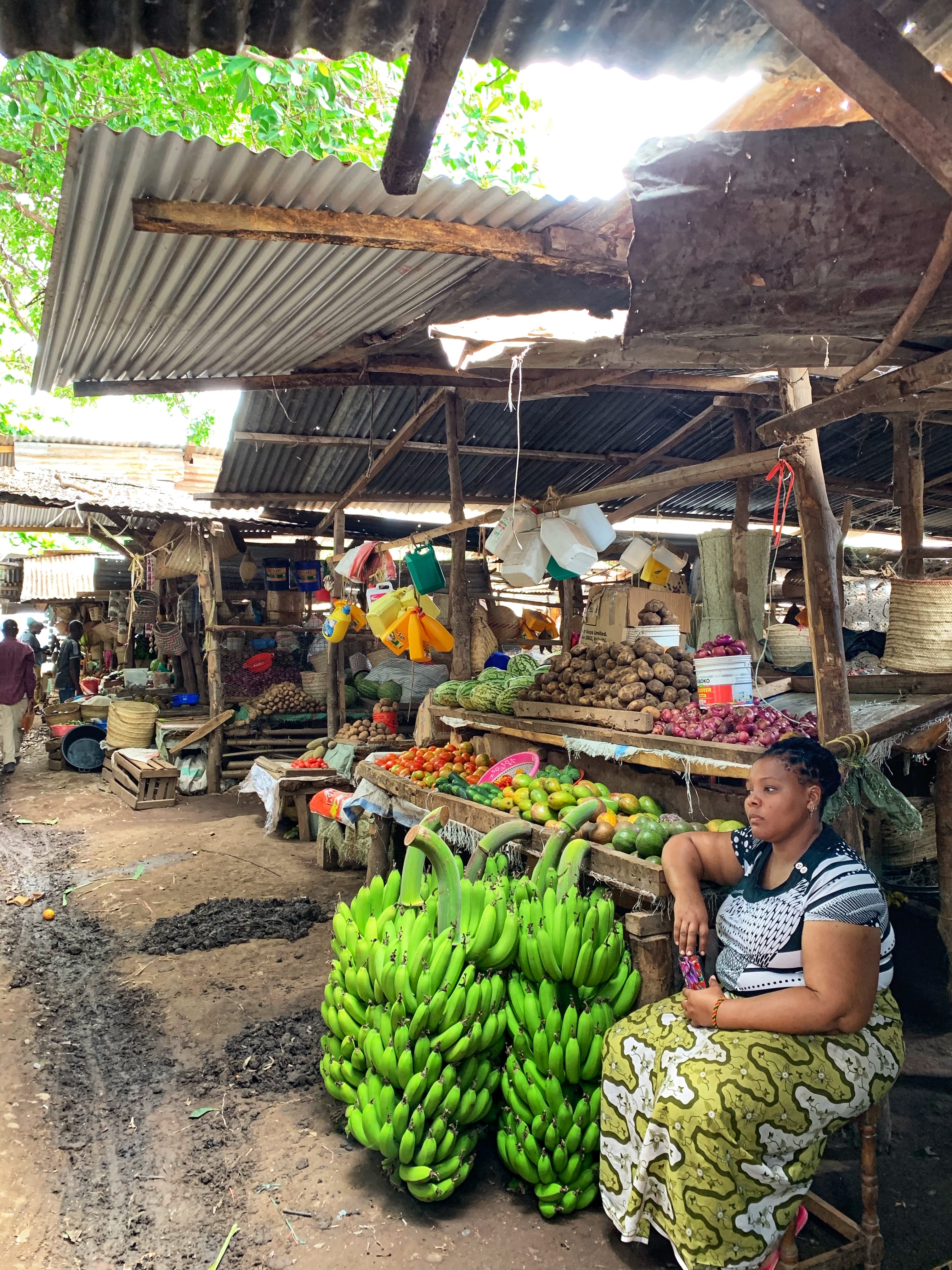 We stopped briefly at the Mto wa Mbu Market, the village’s main market for everyday goods. The whole area felt like a working hub — trucks piled high with bananas pulling in and out, men shaking loose the leaves used as packing, and vendors unloading baskets straight onto the dirt.