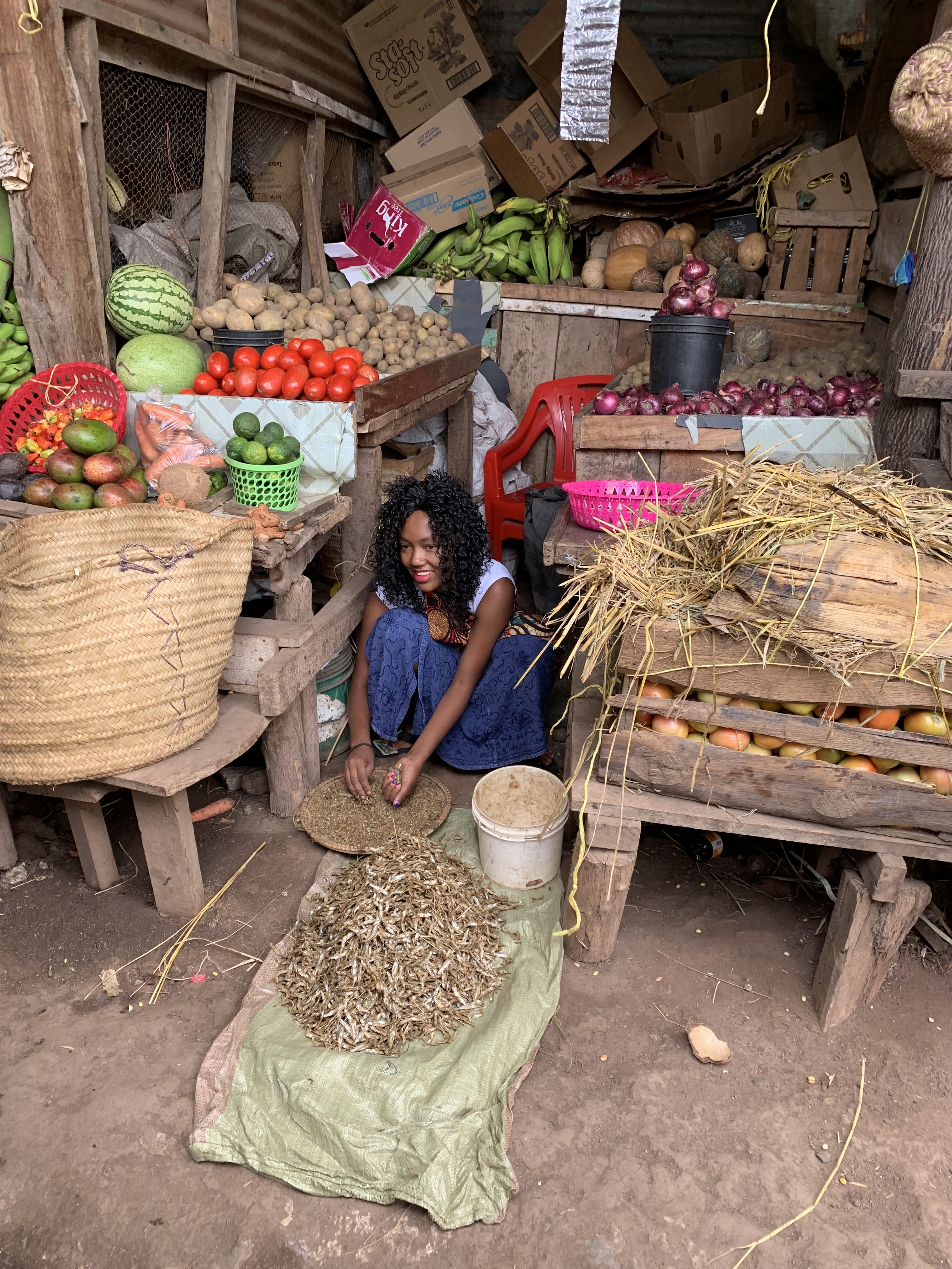 Inside the market, the aisles were narrow and uneven — baskets hung from the tops of wooden stalls. Many vendors sold vegetables and fruit — onions, avocados, and bananas stacked in small piles — while others offered nuts and spices. It wasn’t so different from other markets I’ve visited, but there were always small differences—bananas still hanging in full bunches, unfamiliar fruits and vegetables — that made it feel specific to this village and the people who call it home.