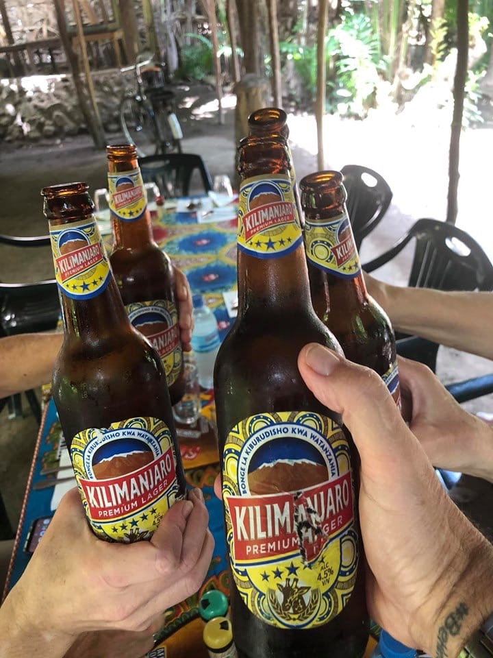 Lunch was served under banana trees, with simple tables set up in the shade. The food was traditional — rice, vegetables, beans, fresh fruit — and cold bottles of Kilimanjaro beer.