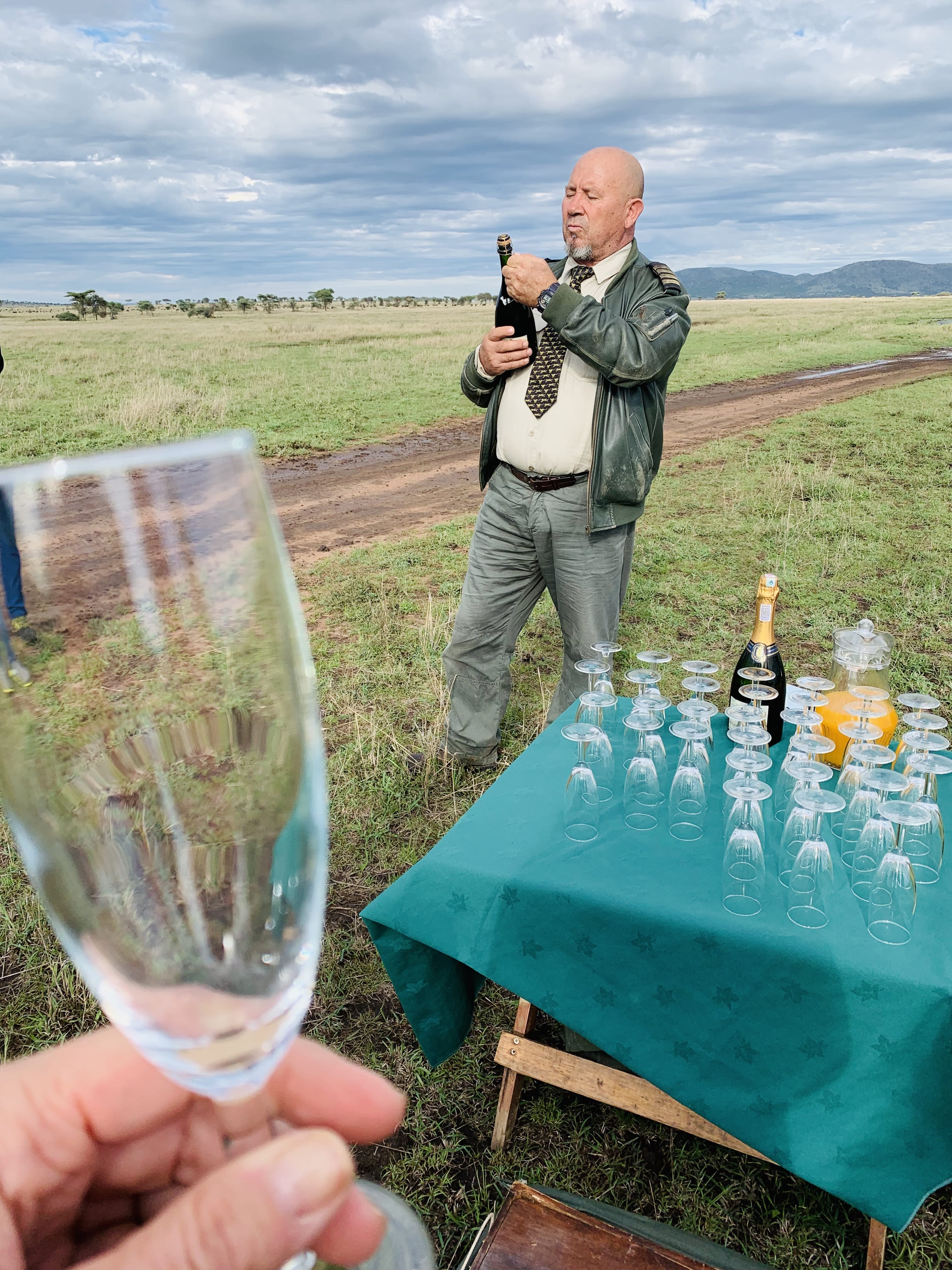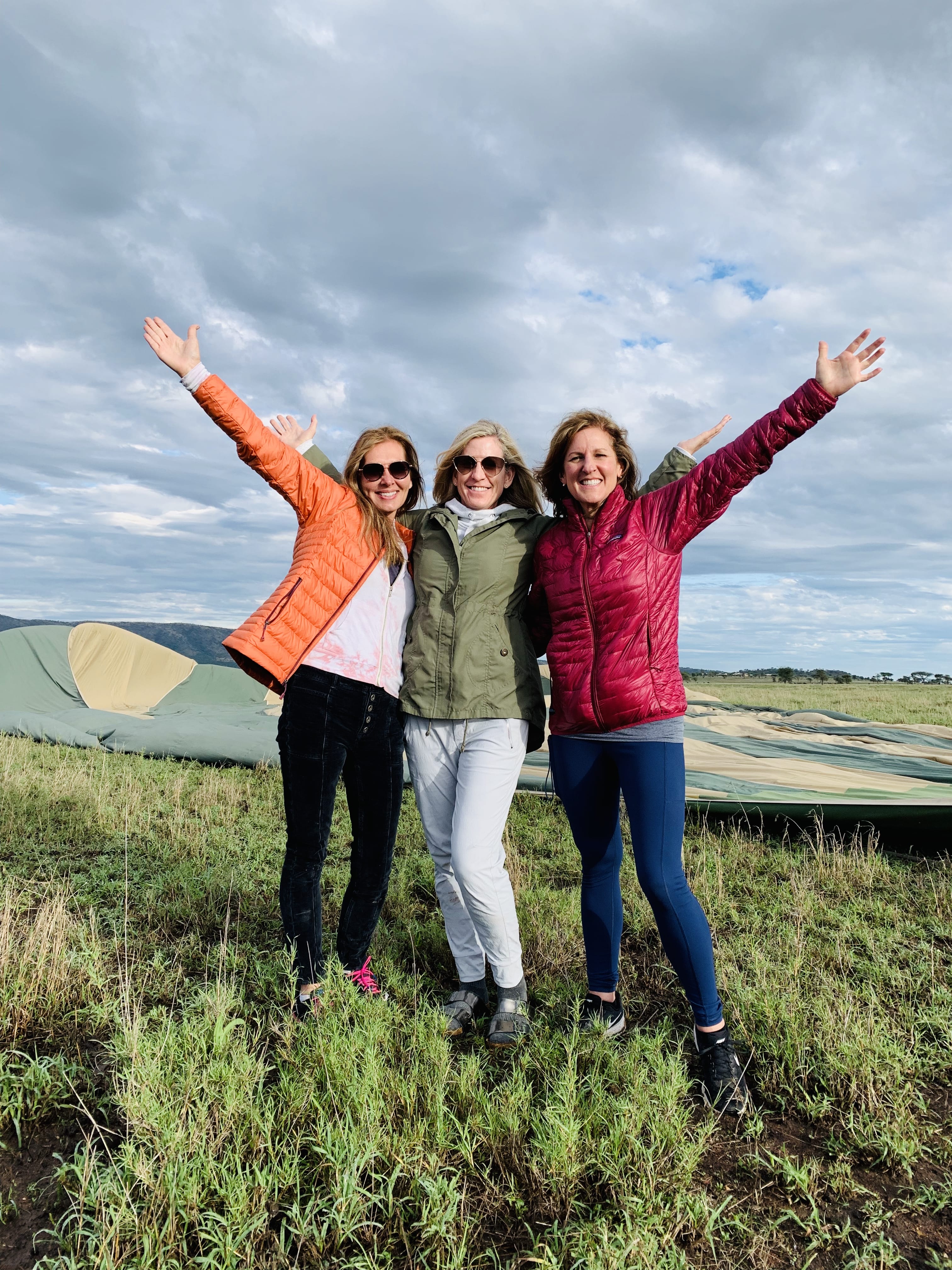 A 4:30 a.m. wake-up call led to one of the highlights of the entire trip: a sunrise hot air balloon safari over Serengeti National Park. Watching the balloon inflate was a moment in itself—the basket was tipped on its side, so we climbed in horizontally. As it filled, the basket slowly lifted upright, and then the balloon carried us into the air.